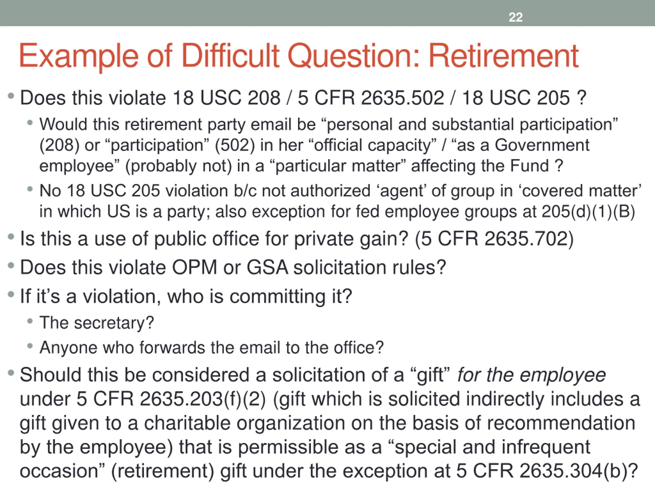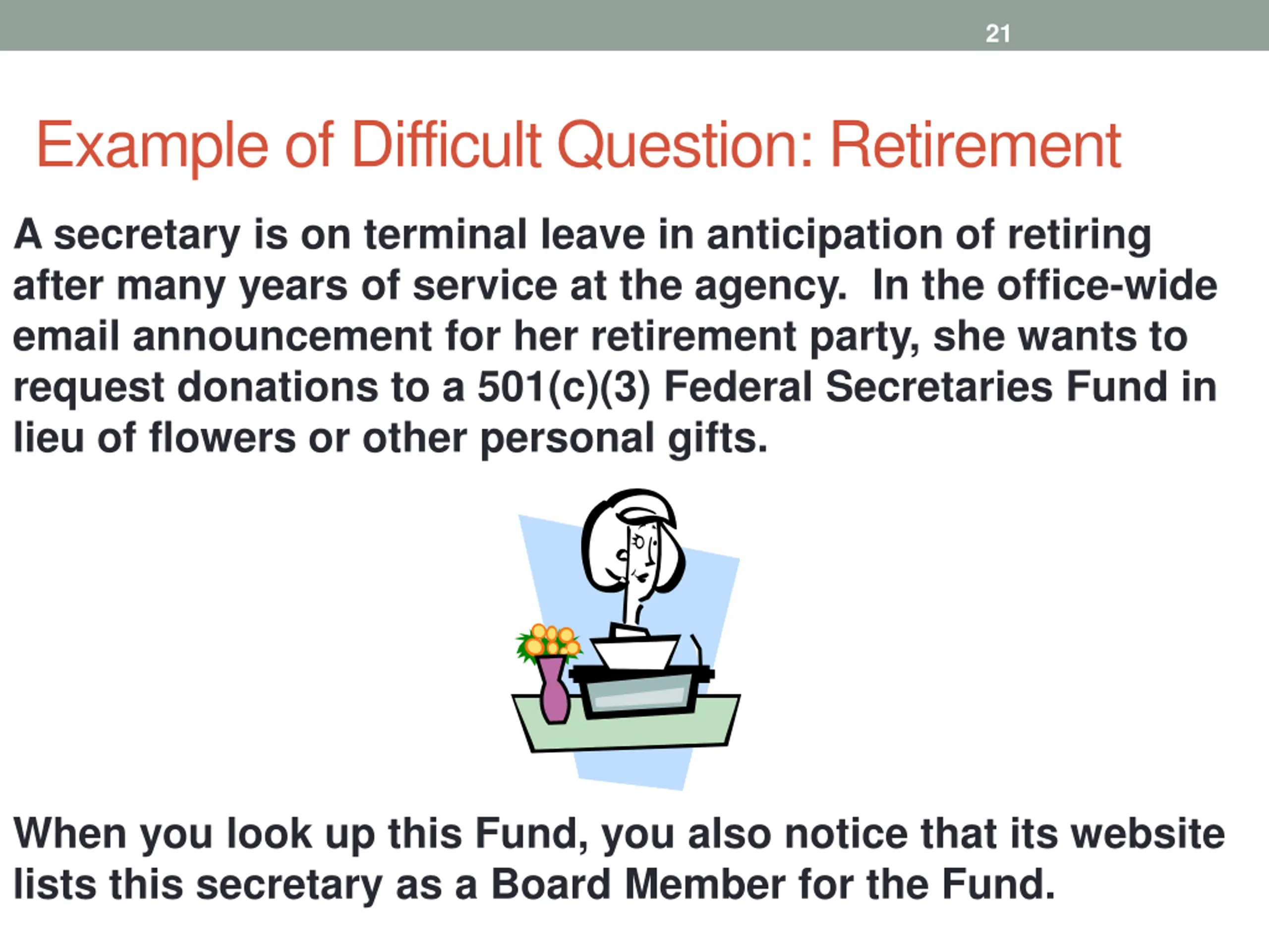 21 Example of Difficult Question: Retirement A secretary is on terminal leave in anticipation of retiring after many years of service at the agency. In the office-wide email announcement for her retirement party, she wants to request donations to a 501(c)(3) Federal Secretaries Fund in lieu of flowers or other personal gifts. When you look up this Fund, you also notice that its website lists this secretary as a Board Member for the Fund.