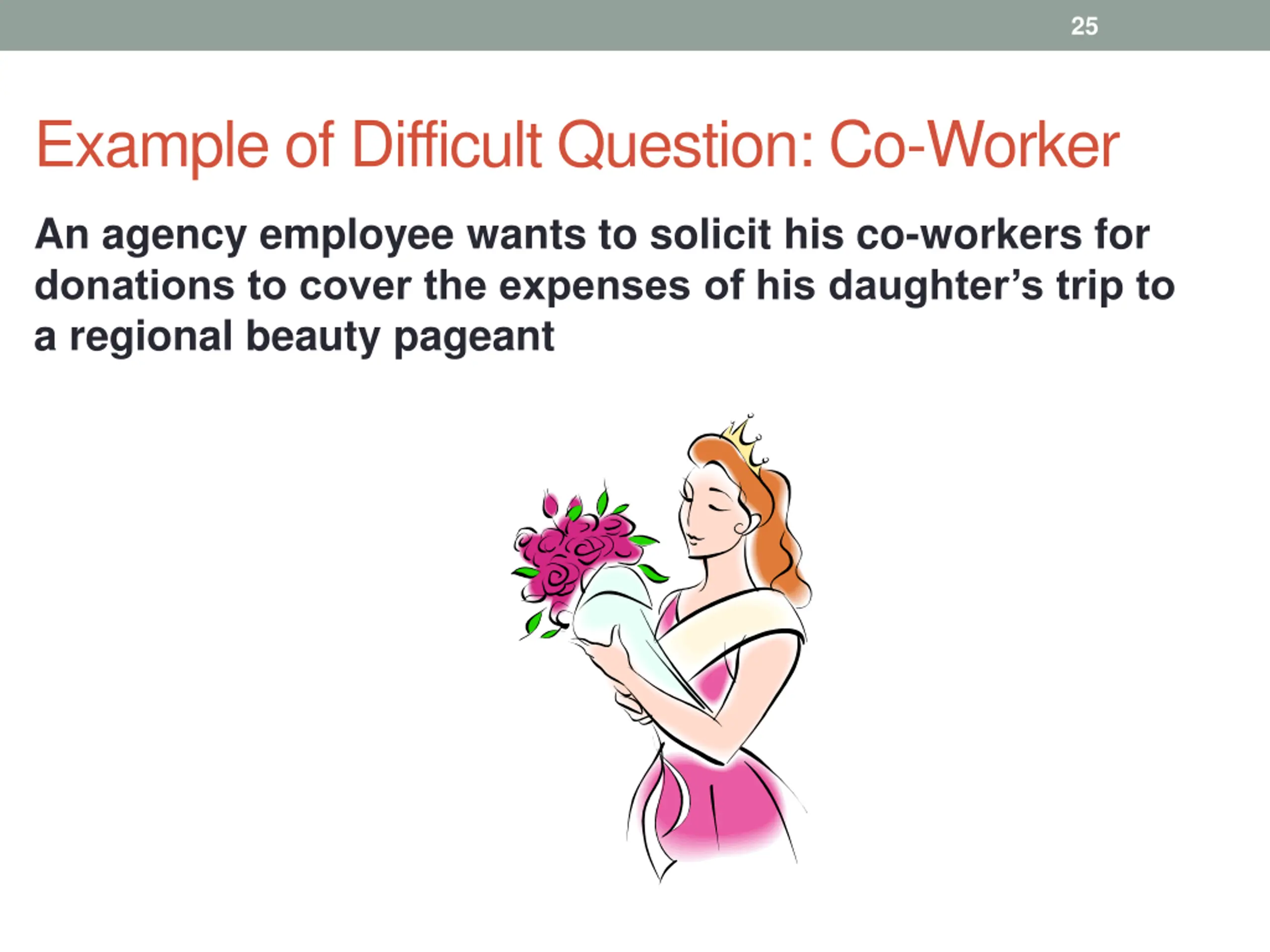 25 Example of Difficult Question: Co-Worker An agency employee wants to solicit his co-workers for donations to cover the expenses of his daughter’s trip to a regional beauty pageant