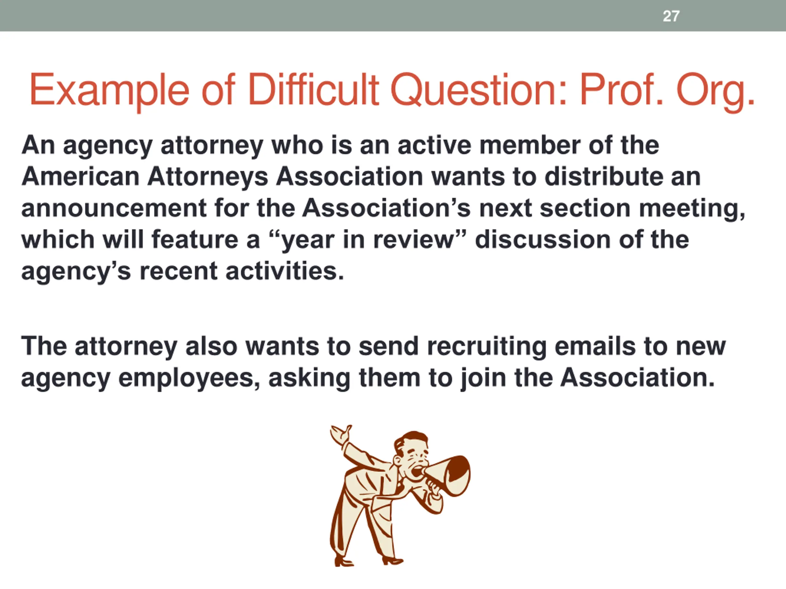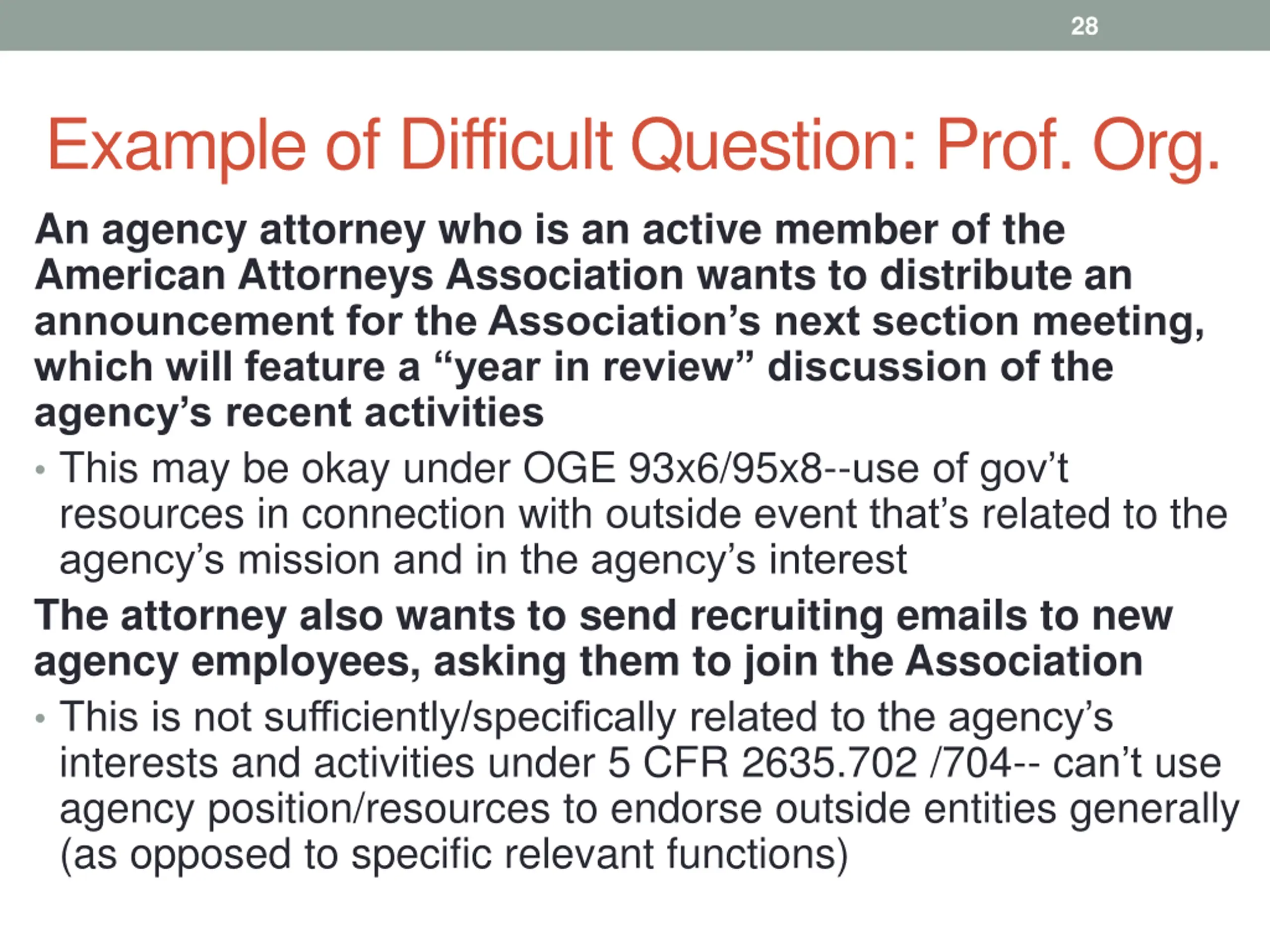 27 Example of Difficult Question: Prof. Org. An agency attorney who is an active member of the American Attorneys Association wants to distribute an announcement for the Association’s next section meeting, which will feature a “year in review” discussion of the agency’s recent activities. The attorney also wants to send recruiting emails to new agency employees, asking them to join the Association.