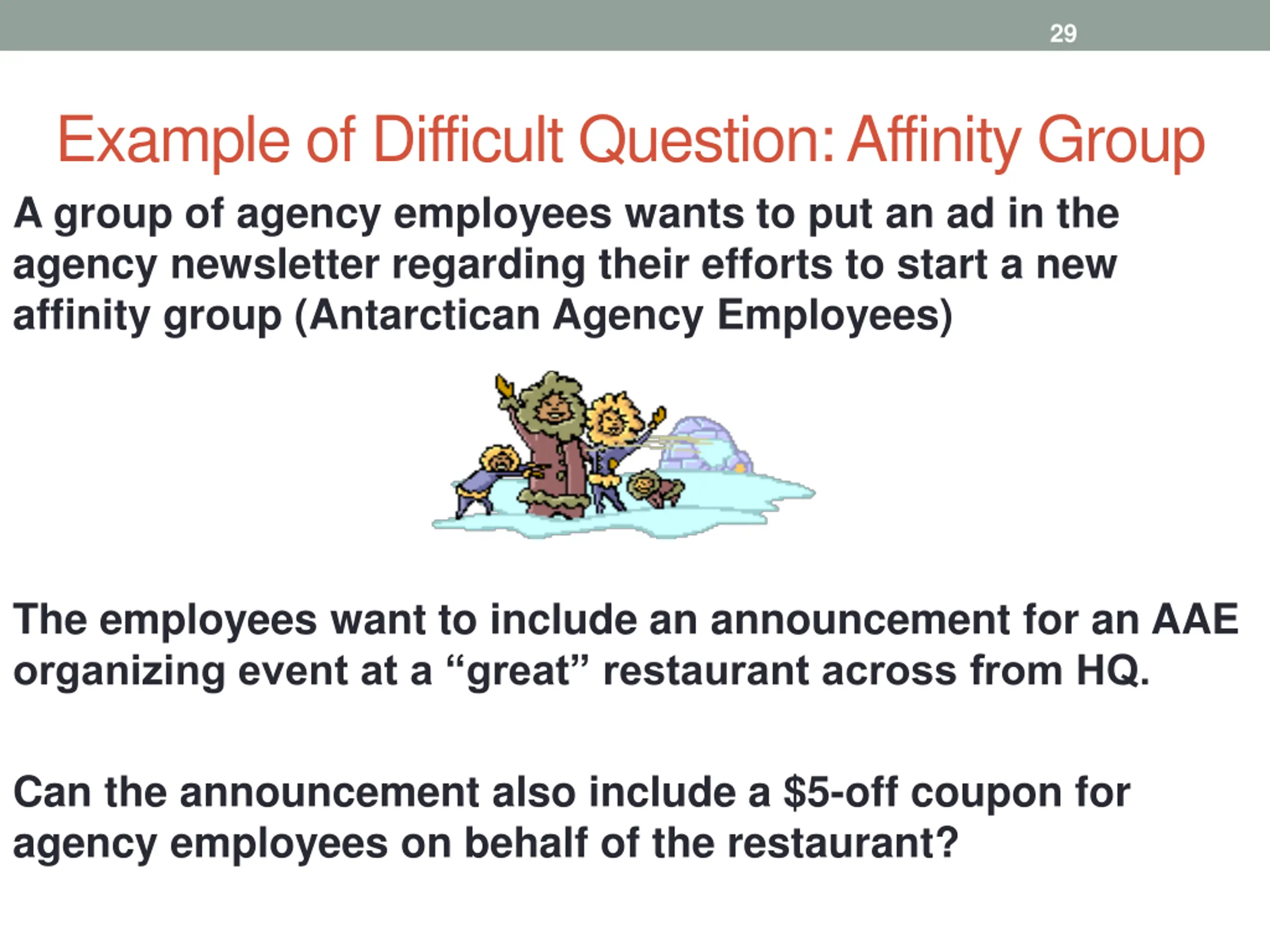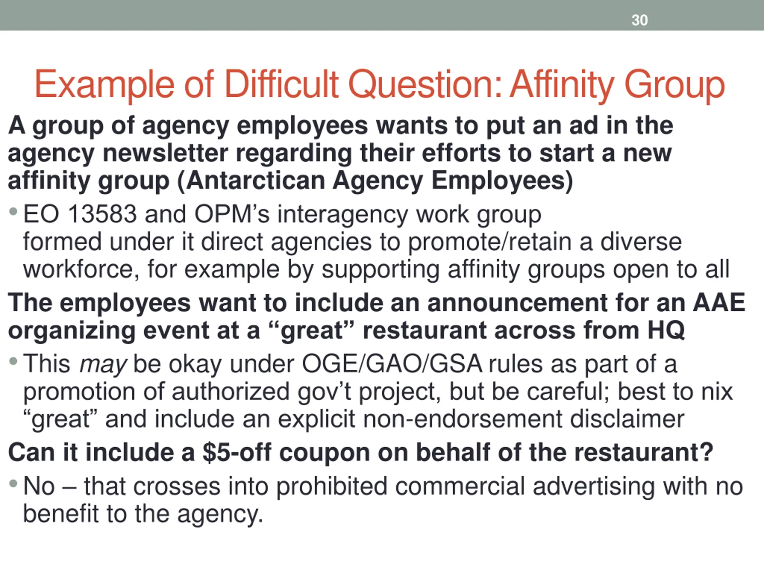 29 Example of Difficult Question: Affinity Group A group of agency employees wants to put an ad in the agency newsletter regarding their efforts to start a new affinity group (Antarctican Agency Employees) The employees want to include an announcement for an AAE organizing event at a “great” restaurant across from HQ. Can the announcement also include a $5-off coupon for agency employees on behalf of the restaurant?