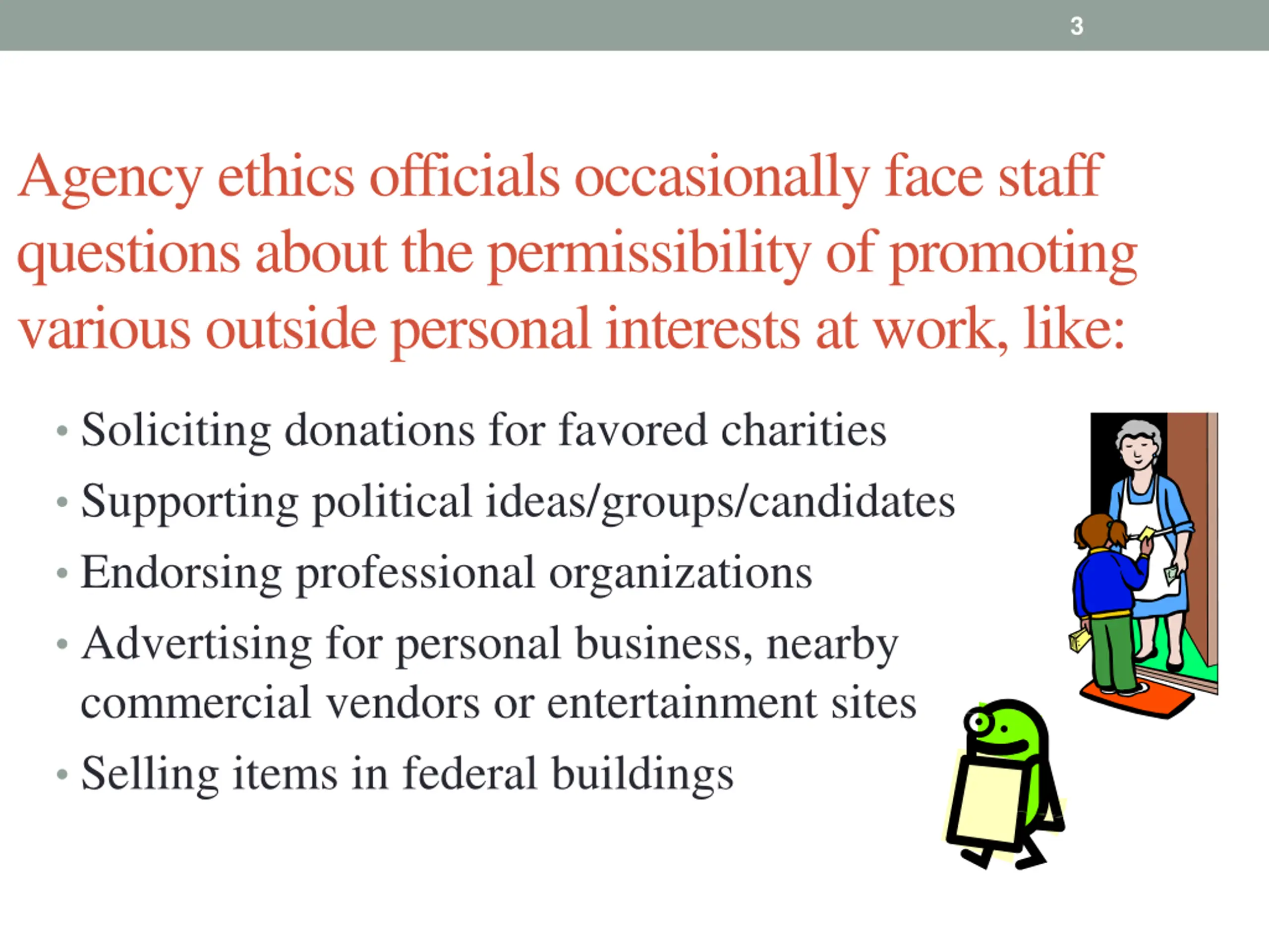 3 Agency ethics officials occasionally face staff questions about the permissibility of promoting various outside personal interests at work, like: • Soliciting donations for favored charities • Supporting political ideas/groups/candidates • Endorsing professional organizations • Advertising for personal business, nearby commercial vendors or entertainment sites • Selling items in federal buildings