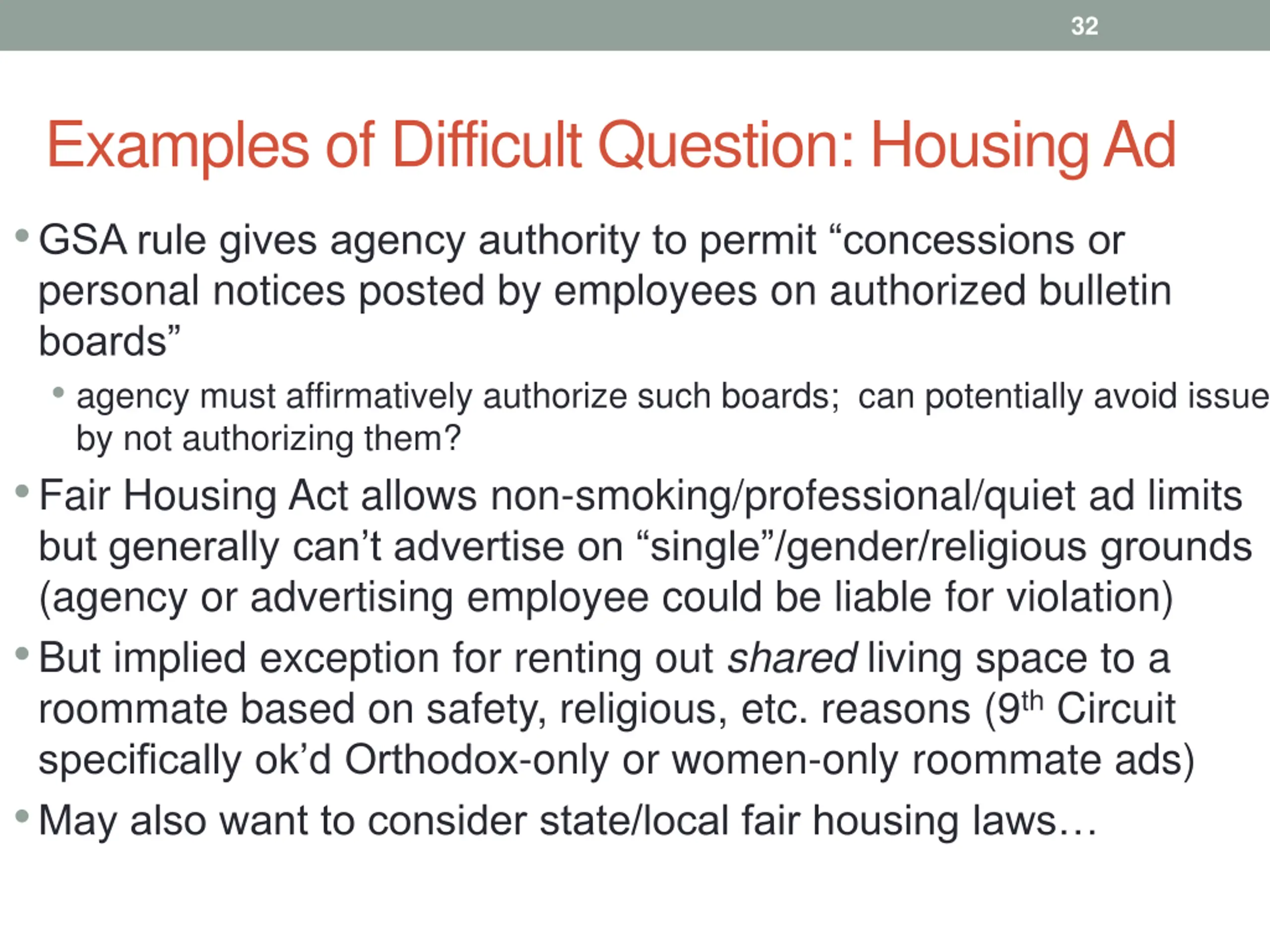 31 Examples of Difficult Question: Housing Ad An agency employee wants to post a personal ad on agency bulletin board for her apartment, which notes that she prefers “quiet, single, non-smoking, professional, Orthodox female” tenants