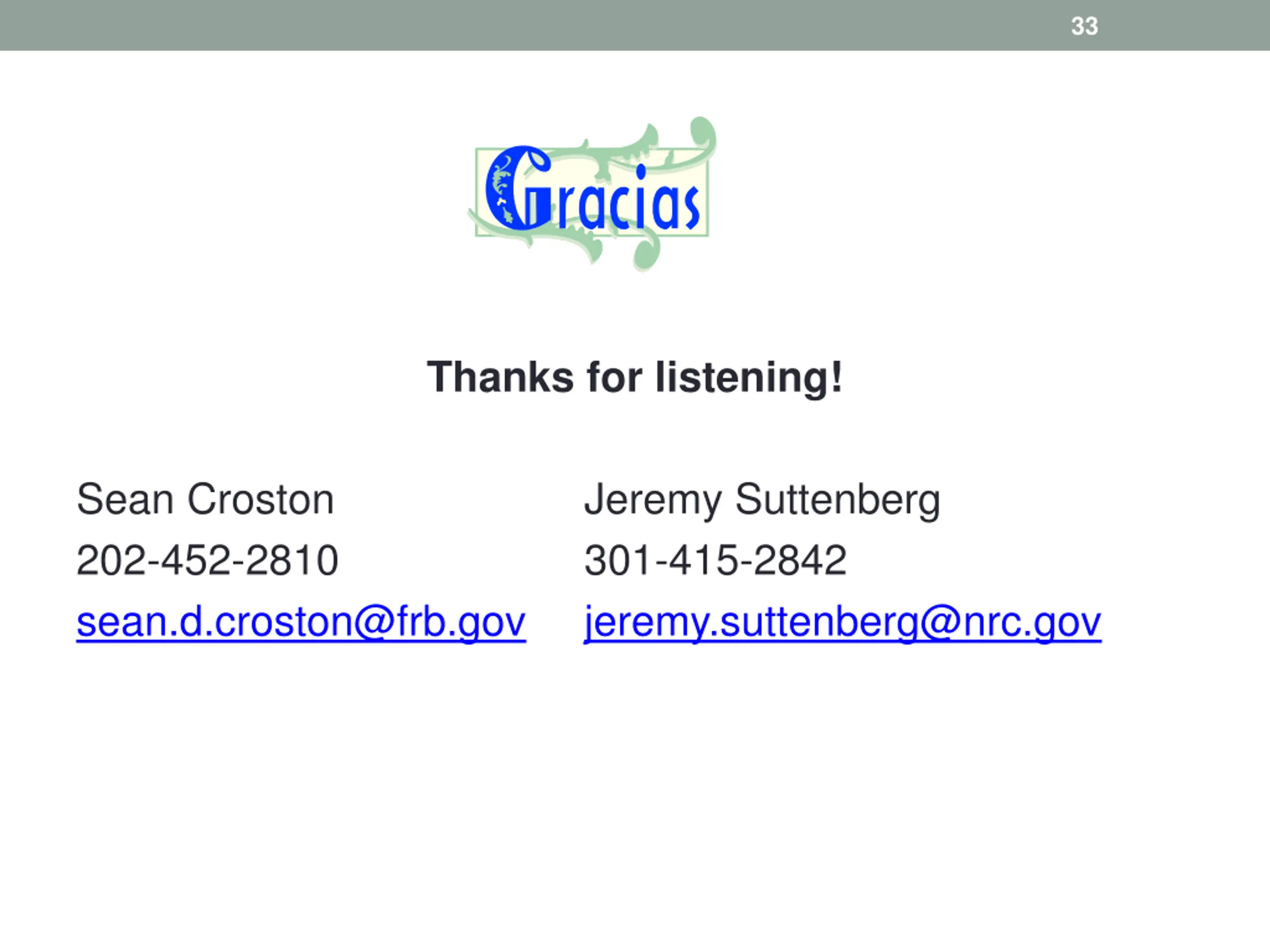 33 Thanks for listening! Sean Croston 202-452-2810 sean.d.croston@frb.gov Jeremy Suttenberg 301-415-2842 jeremy.suttenberg@nrc.gov