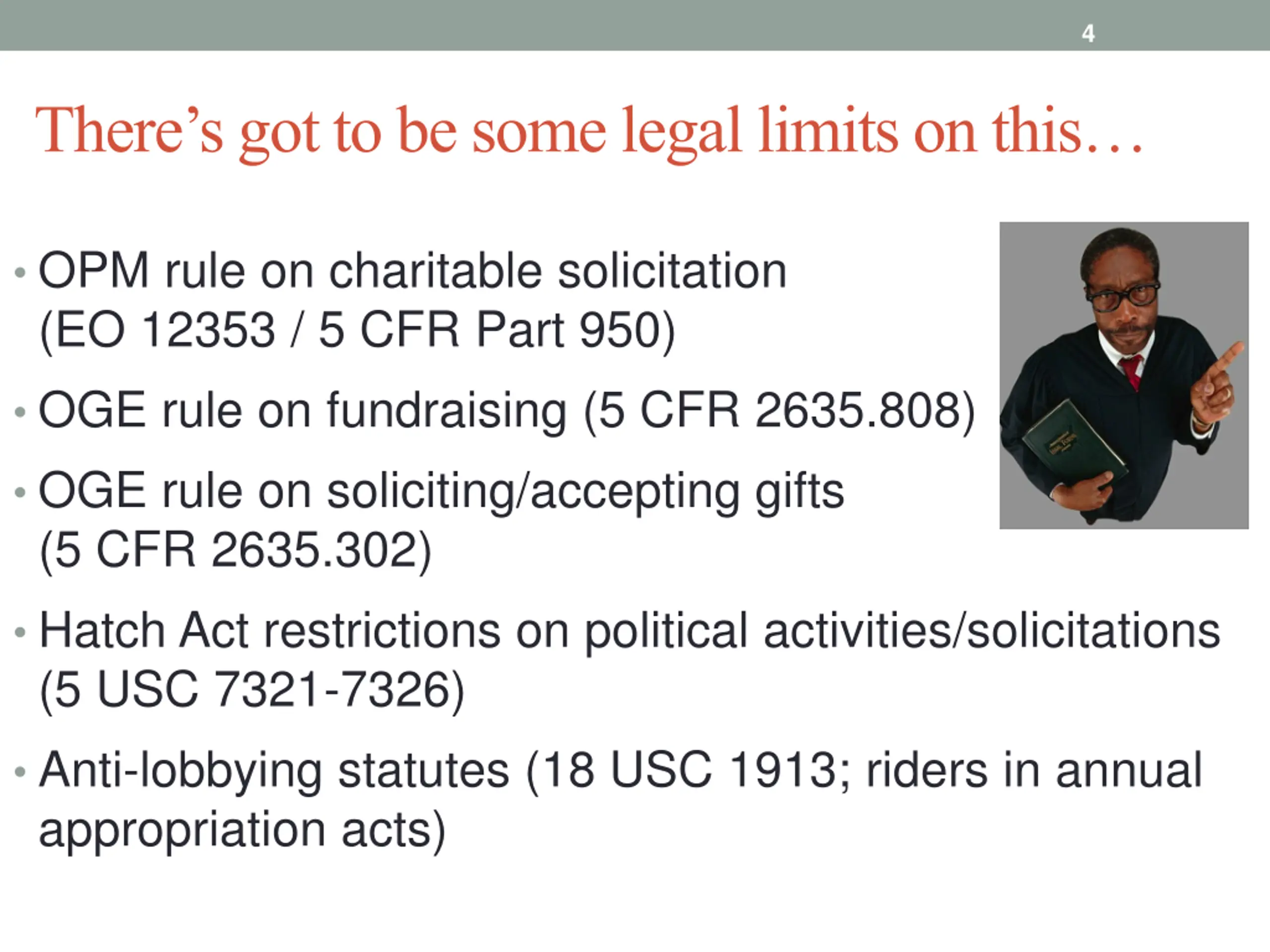 4 There’s got to be some legal limits on this… • OPM rule on charitable solicitation (EO 12353 / 5 CFR Part 950) • OGE rule on fundraising (5 CFR 2635.808) • OGE rule on soliciting/accepting gifts (5 CFR 2635.302) • Hatch Act restrictions on political activities/solicitations (5 USC 7321-7326) • Anti-lobbying statutes (18 USC 1913; riders in annual appropriation acts)
