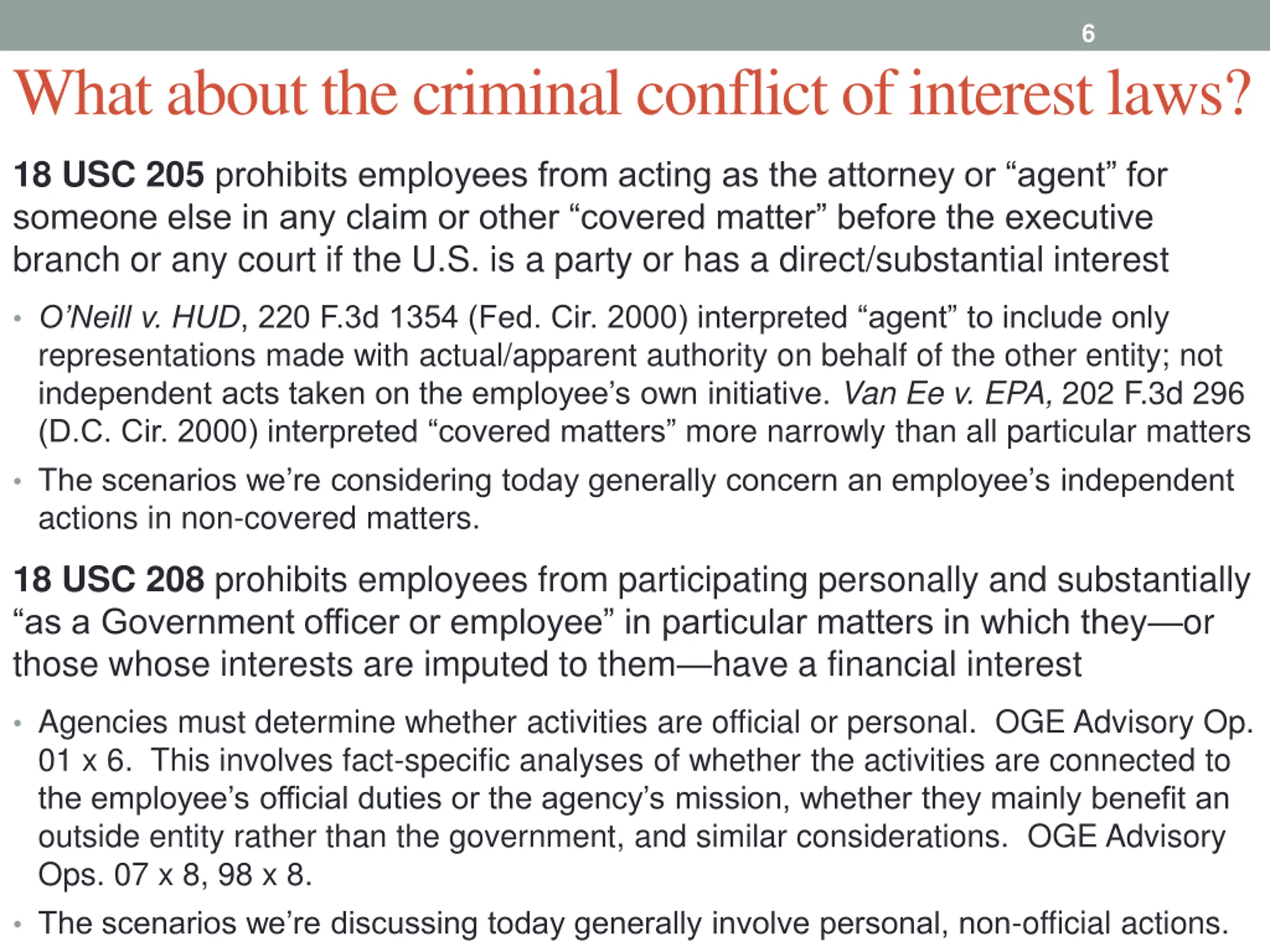 6 What about the criminal conflict of interest laws? 18 USC 205 prohibits employees from acting as the attorney or “agent” for someone else in any claim or other “covered matter” before the executive branch or any court if the U.S. is a party or has a direct/substantial interest • O’Neill v. HUD, 220 F.3d 1354 (Fed. Cir. 2000) interpreted “agent” to include only representations made with actual/apparent authority on behalf of the other entity; not independent acts taken on the employee’s own initiative. Van Ee v. EPA, 202 F.3d 296 (D.C. Cir. 2000) interpreted “covered matters” more narrowly than all particular matters • The scenarios we’re considering today generally concern an employee’s independent actions in non-covered matters. 18 USC 208 prohibits employees from participating personally and substantially “as a Government officer or employee” in particular matters in which they—or those whose interests are imputed to them—have a financial interest • Agencies must determine whether activities are official or personal. OGE Advisory Op. 01 x 6. This involves fact-specific analyses of whether the activities are connected to the employee’s official duties or the agency’s mission, whether they mainly benefit an outside entity rather than the government, and similar considerations. OGE Advisory Ops. 07 x 8, 98 x 8. • The scenarios we’re discussing today generally involve personal, non-official actions.