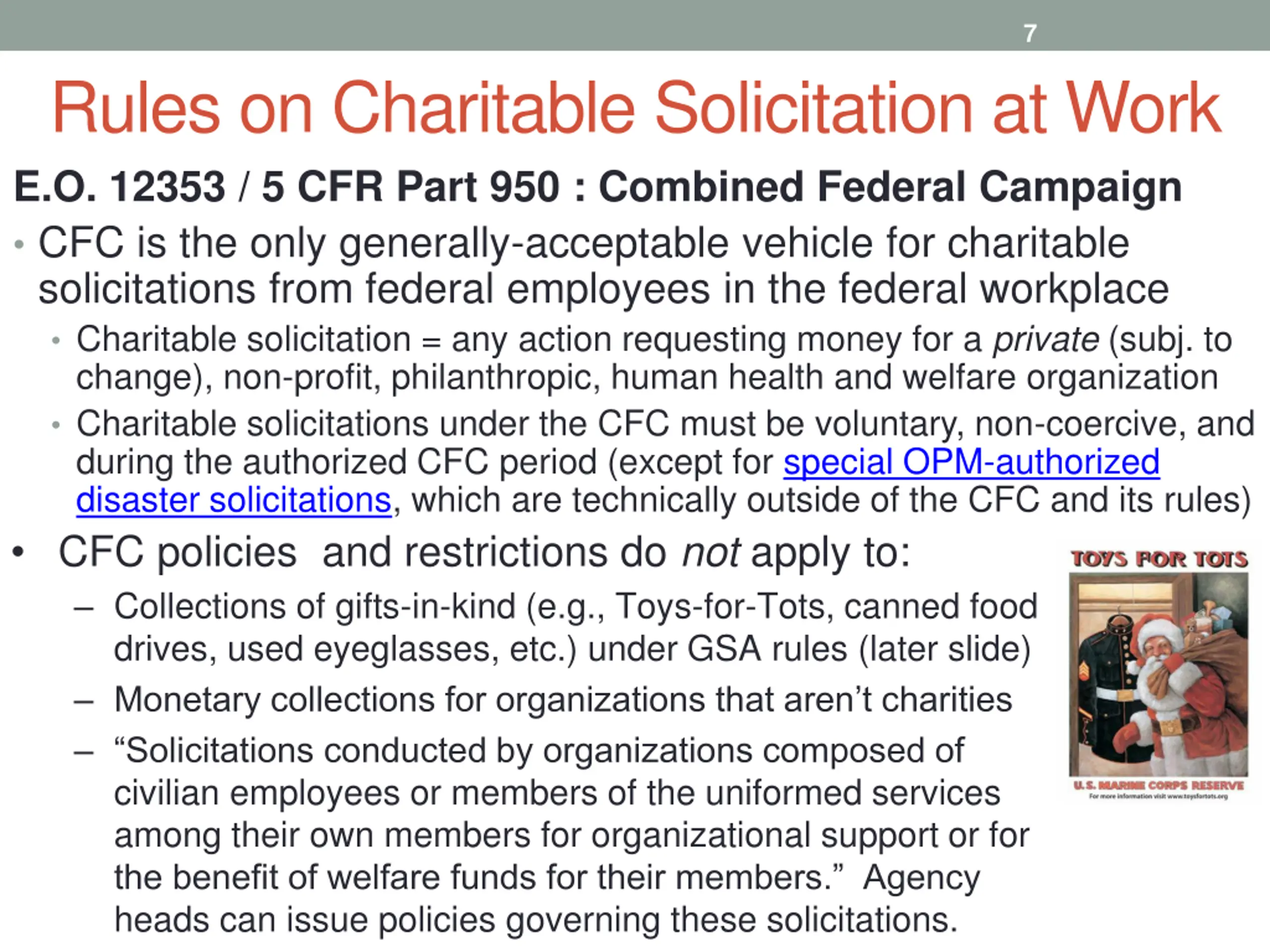 7 Rules on Charitable Solicitation at Work E.O. 12353 / 5 CFR Part 950 : Combined Federal Campaign • CFC is the only generally-acceptable vehicle for charitable solicitations from federal employees in the federal workplace • Charitable solicitation = any action requesting money for a private (subj. to change), non-profit, philanthropic, human health and welfare organization • Charitable solicitations under the CFC must be voluntary, non-coercive, and during the authorized CFC period (except for special OPM-authorized disaster solicitations, which are technically outside of the CFC and its rules) • CFC policies and restrictions do not apply to: – Collections of gifts-in-kind (e.g., Toys-for-Tots, canned food drives, used eyeglasses, etc.) under GSA rules (later slide) – Monetary collections for organizations that aren’t charities – “Solicitations conducted by organizations composed of civilian employees or members of the uniformed services among their own members for organizational support or for the benefit of welfare funds for their members.” Agency heads can issue policies governing these solicitations.