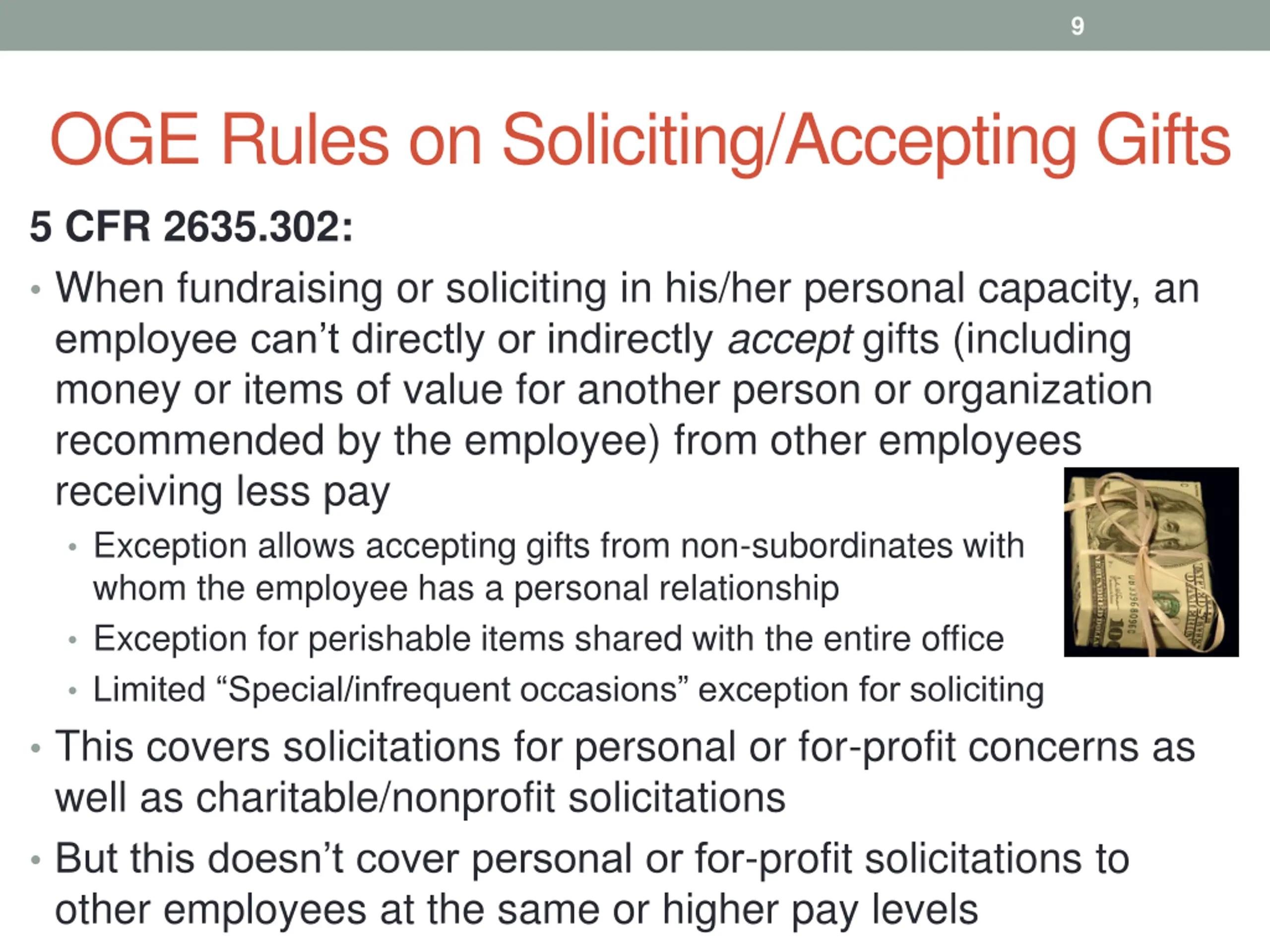 9 OGE Rules on Soliciting/Accepting Gifts 5 CFR 2635.302: • When fundraising or soliciting in his/her personal capacity, an employee can’t directly or indirectly accept gifts (including money or items of value for another person or organization recommended by the employee) from other employees receiving less pay • Exception allows accepting gifts from non-subordinates with whom the employee has a personal relationship • Exception for perishable items shared with the entire office • Limited “Special/infrequent occasions” exception for soliciting • This covers solicitations for personal or for-profit concerns as well as charitable/nonprofit solicitations • But this doesn’t cover personal or for-profit solicitations to other employees at the same or higher pay levels