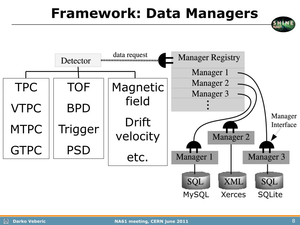 Framework: Data Managers TOF BPD Trigger PSD Magnetic field Drift velocity etc. TPC VTPC MTPC GTPC MySQL SQLite Xerces