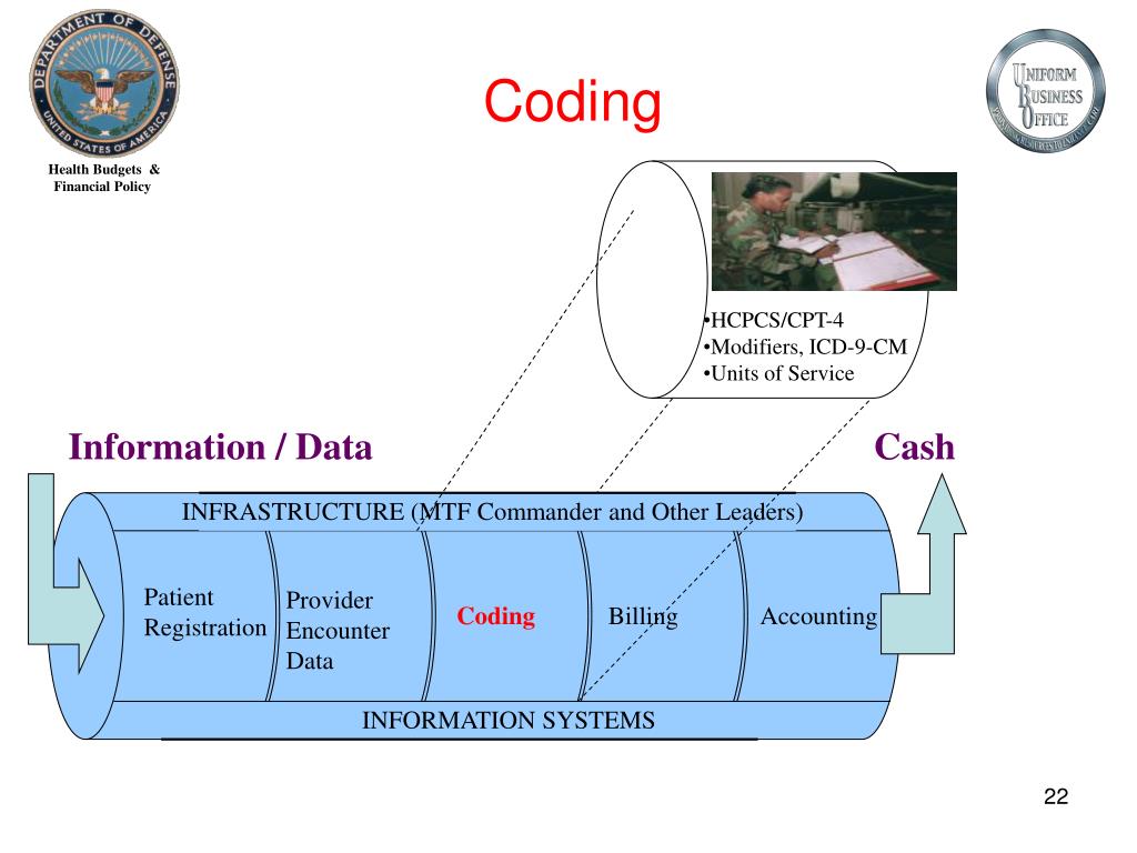 Coding • HCPCS/CPT-4 • Modifiers, ICD-9-CM • Units of Service Information / Data Cash INFRASTRUCTURE (MTF Commander and Other Leaders) Patient Registration Patient Registration Provider Encounter Data Coding Billing Accounting INFORMATION SYSTEMS