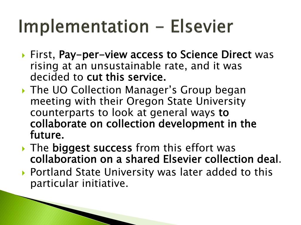 Implementation - Elsevier • First, Pay-per-view access to Science Direct was rising at an unsustainable rate, and it was decided to cut this service. • The UO Collection Manager’s Group began meeting with their Oregon State University counterparts to look at general ways to collaborate on collection development in the future. • The biggest success from this effort was collaboration on a shared Elsevier collection deal. • Portland State University was later added to this particular initiative.