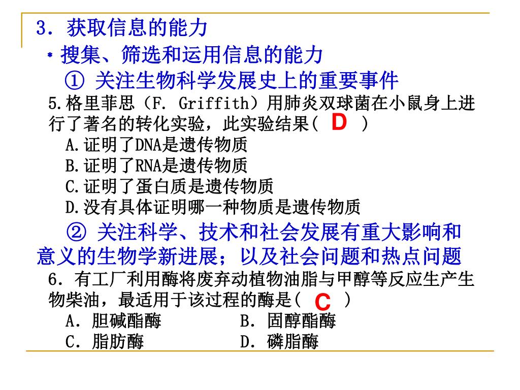 3.获取信息的能力 ﹡搜集、筛选和运用信息的能力 ① 关注生物科学发展史上的重要事件 5.格里菲思(F. Griffith)用肺炎双球菌在小鼠身上进行了著名的转化实验,此实验结果( ) A.证明了DNA是遗传物质 B.证明了RNA是遗传物质 C.证明了蛋白质是遗传物质 D.没有具体证明哪一种物质是遗传物质 D ② 关注科学、技术和社会发展有重大影响和意义的生物学新进展;以及社会问题和热点问题 6.有工厂利用酶将废弃动植物油脂与甲醇等反应生产生物柴油,最适用于该过程的酶是( ) A.胆碱酯酶 B.固醇酯酶 C.脂肪酶 D.磷脂酶 C