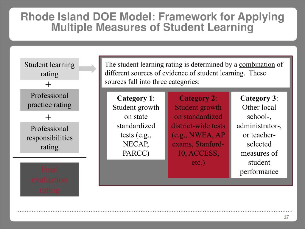 Rhode Island DOE Model: Framework for Applying Multiple Measures of Student Learning The student learning rating is determined by a combination of different sources of evidence of student learning. These sources fall into three categories: Student learning rating + Professional practice rating Category 1: Student growth on state standardized tests (e.g., NECAP, PARCC) Category 2: Student growth on standardized district-wide tests (e.g., NWEA, AP exams, Stanford-10, ACCESS, etc.) Category 3: Other local school-, administrator-, or teacher-selected measures of student performance + Professional responsibilities rating Final evaluation rating