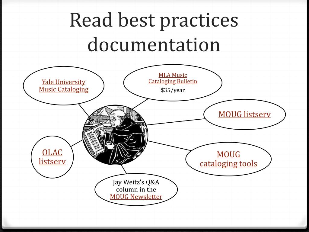 Get some training source • California Library Association webinar • Cataloging Musical Scores and Sound Recordings Workshop (2012) • $95, includes video & slides • 8 hours • Kathy Glennan webinars • RDA & Music Basics: Sound Recordings (2011) • RDA & Music Basics: Scores (2011) • Freely available through ALCTS, includes video & slides • 1 hour each • Jay Weitz slides • Sound Recordings Cataloging Workshop (2012) • Freely available slides through OLAC • OLAC workshops • Membership: $20 (!!!) • Conference registration: $199 (2012) Find your Yoda.