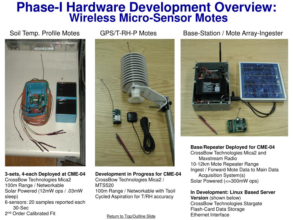 Soil Temp. Profile Motes GPS/T-RH-P Motes Base-Station / Mote Array-Ingester 3-sets, 4-each Deployed at CME-04 CrossBow Technologies Mica2 100m Range / Networkable Solar Powered (12mW ops / .03mW sleep) 6-sensors: 20 samples reported each 30-Sec 2nd Order Calibrated Fit Development in Progress for CME-04 CrossBow Technologies Mica2 / MTS520 100m Range / Networkable with Tsoil Cycled Aspiration for T/RH accuracy Base/Repeater Deployed for CME-04 CrossBow Technologies Mica2 and Maxstream Radio 10-12km Mote Repeater Range Ingest / Forward Mote Data to Main Data Acquisition System(s) Solar Powered (<=300mW ops) In Development: Linux Based Server Version (shown below) CrossBow Technologies Stargate Flash-Card Data Storage Ethernet Interface Phase-I Hardware Development Overview:Wireless Micro-Sensor Motes Return to Top/Outline Slide