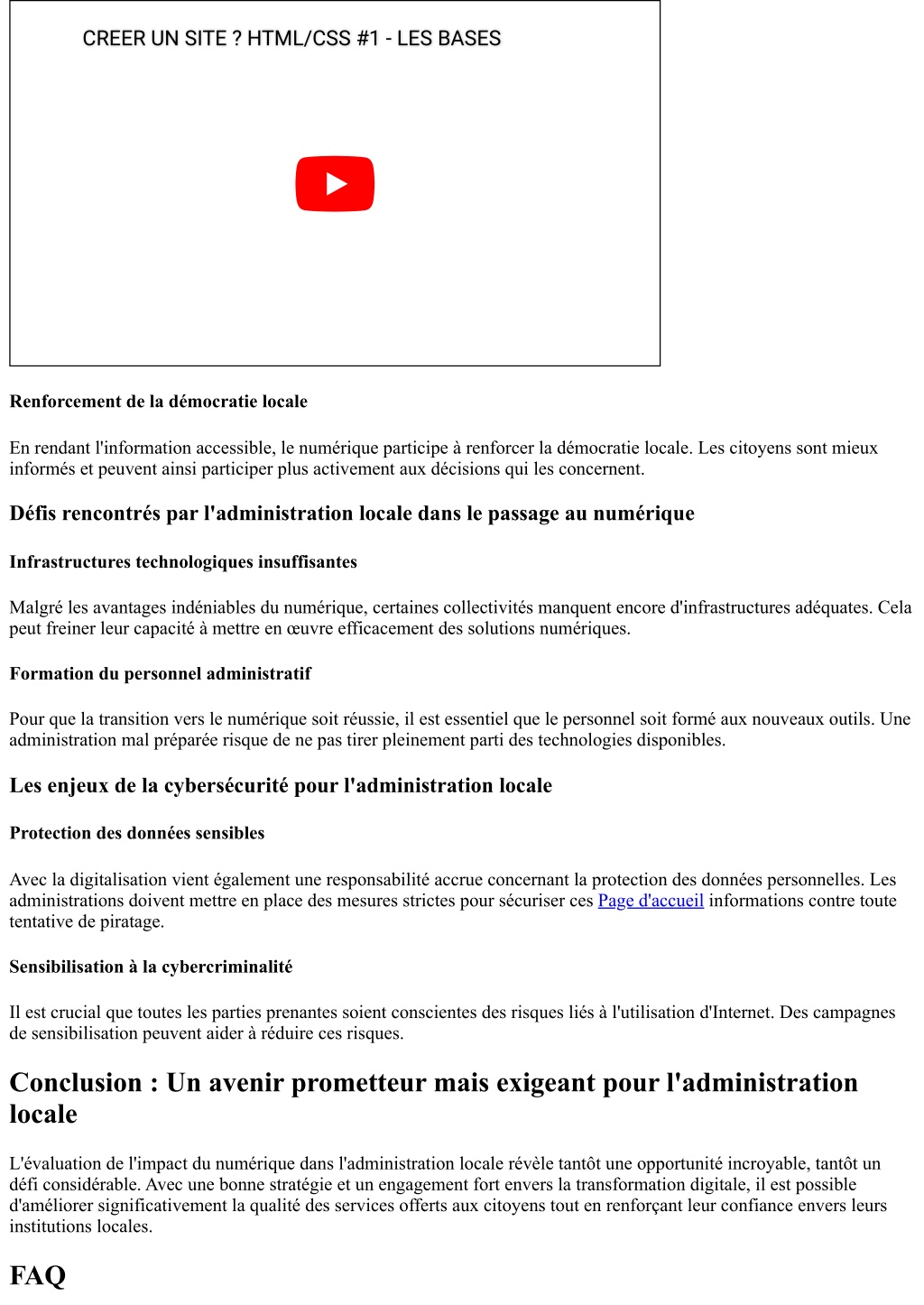 CREER UN SITE ? HTML/CSS #1 - LES BASES CREER UN SITE ? HTML/CSS #1 - LES BASES Renforcement de la démocratie locale En rendant l'information accessible, le numérique participe à renforcer la démocratie locale. Les citoyens sont mieux informés et peuvent ainsi participer plus activement aux décisions qui les concernent. Défis rencontrés par l'administration locale dans le passage au numérique Infrastructures technologiques insuffisantes Malgré les avantages indéniables du numérique, certaines collectivités manquent encore d'infrastructures adéquates. Cela peut freiner leur capacité à mettre en œuvre efficacement des solutions numériques. Formation du personnel administratif Pour que la transition vers le numérique soit réussie, il est essentiel que le personnel soit formé aux nouveaux outils. Une administration mal préparée risque de ne pas tirer pleinement parti des technologies disponibles. Les enjeux de la cybersécurité pour l'administration locale Protection des données sensibles Avec la digitalisation vient également une responsabilité accrue concernant la protection des données personnelles. Les administrations doivent mettre en place des mesures strictes pour sécuriser ces Page d'accueil informations contre toute tentative de piratage. Sensibilisation à la cybercriminalité Il est crucial que toutes les parties prenantes soient conscientes des risques liés à l'utilisation d'Internet. Des campagnes de sensibilisation peuvent aider à réduire ces risques. Conclusion : Un avenir prometteur mais exigeant pour l'administration locale L'évaluation de l'impact du numérique dans l'administration locale révèle tantôt une opportunité incroyable, tantôt un défi considérable. Avec une bonne stratégie et un engagement fort envers la transformation digitale, il est possible d'améliorer significativement la qualité des services offerts aux citoyens tout en renforçant leur confiance envers leurs institutions locales. FAQ