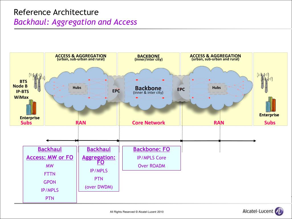 Reference ArchitectureBackhaul: Aggregation and Access Backhaul Access: MW or FO MW FTTN GPON IP/MPLS PTN Backhaul Aggregation: FO IP/MPLS PTN (over DWDM) Backbone: FO IP/MPLS Core Over ROADM