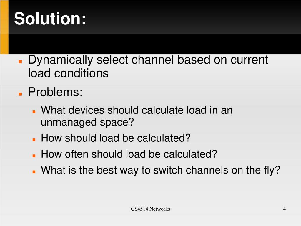CS4514 Networks Solution: • Dynamically select channel based on current load conditions • Problems: • What devices should calculate load in an unmanaged space? • How should load be calculated? • How often should load be calculated? • What is the best way to switch channels on the fly?