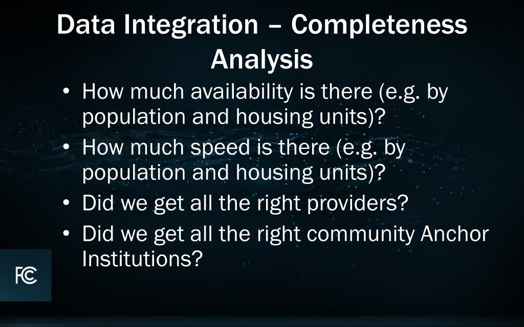 Data Integration – Completeness Analysis • How much availability is there (e.g. by population and housing units)? • How much speed is there (e.g. by population and housing units)? • Did we get all the right providers? • Did we get all the right community Anchor Institutions?