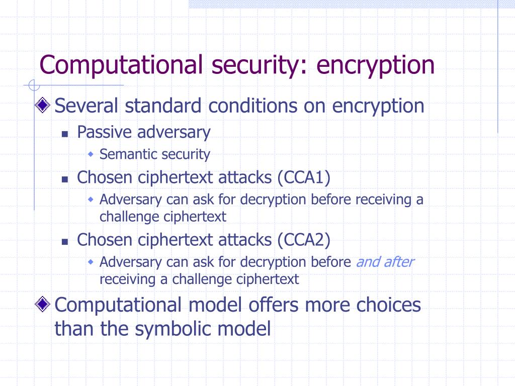 Computational security: encryption • Several standard conditions on encryption • Passive adversary • Semantic security • Chosen ciphertext attacks (CCA1) • Adversary can ask for decryption before receiving a challenge ciphertext • Chosen ciphertext attacks (CCA2) • Adversary can ask for decryption before and after receiving a challenge ciphertext • Computational model offers more choices than the symbolic model