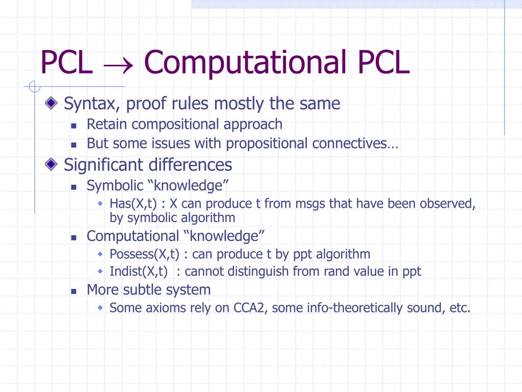 PCL Computational PCL • Syntax, proof rules mostly the same • Retain compositional approach • But some issues with propositional connectives… • Significant differences • Symbolic “knowledge” • Has(X,t) : X can produce t from msgs that have been observed, by symbolic algorithm • Computational “knowledge” • Possess(X,t) : can produce t by ppt algorithm • Indist(X,t) : cannot distinguish from rand value in ppt • More subtle system • Some axioms rely on CCA2, some info-theoretically sound, etc.