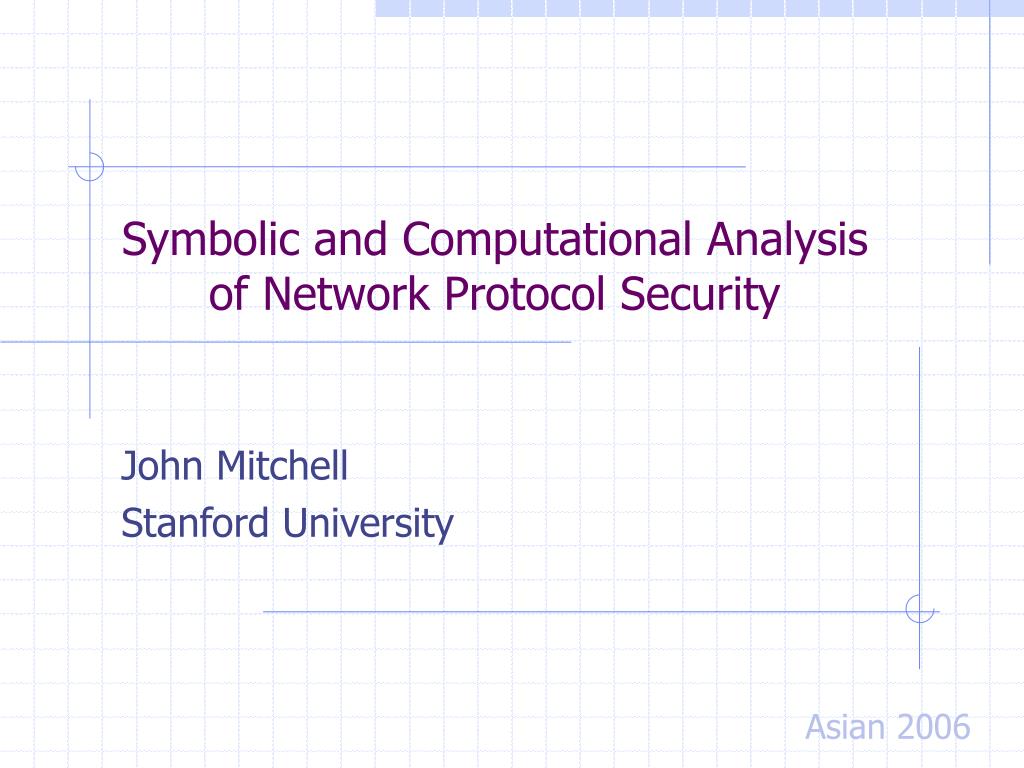 Symbolic and Computational Analysis of Network Protocol Security. John Mitchell Stanford University. Asian 2006. Outline. Protocols Some examples, some intuition Symbolic analysis of protocol security Models, results, tools Computational analysis