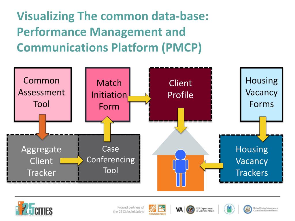 Visualizing The common data-base:Performance Management and Communications Platform (PMCP) Common Assessment Tool Housing Vacancy Forms Match Initiation Form Client Profile Aggregate Client Tracker Case Conferencing Tool Housing Vacancy Trackers