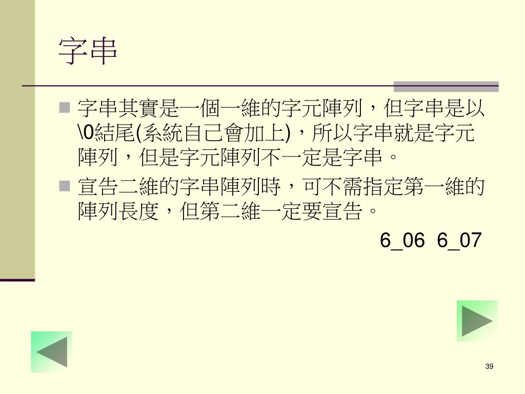 字串 • 字串其實是一個一維的字元陣列,但字串是以\0結尾(系統自己會加上),所以字串就是字元陣列,但是字元陣列不一定是字串。 • 宣告二維的字串陣列時,可不需指定第一維的陣列長度,但第二維一定要宣告。 6_06 6_07