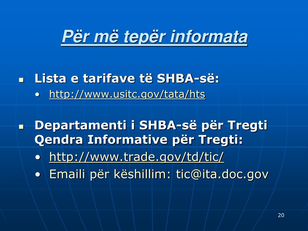 Për më tepër informata Lista e tarifave të SHBA-së: http://www.usitc.gov/tata/hts Departamenti i SHBA-së për Tregti Qendra Informative për Tregti: http://www.trade.gov/td/tic/ Emailipër këshillim: tic@ita.doc.gov 20