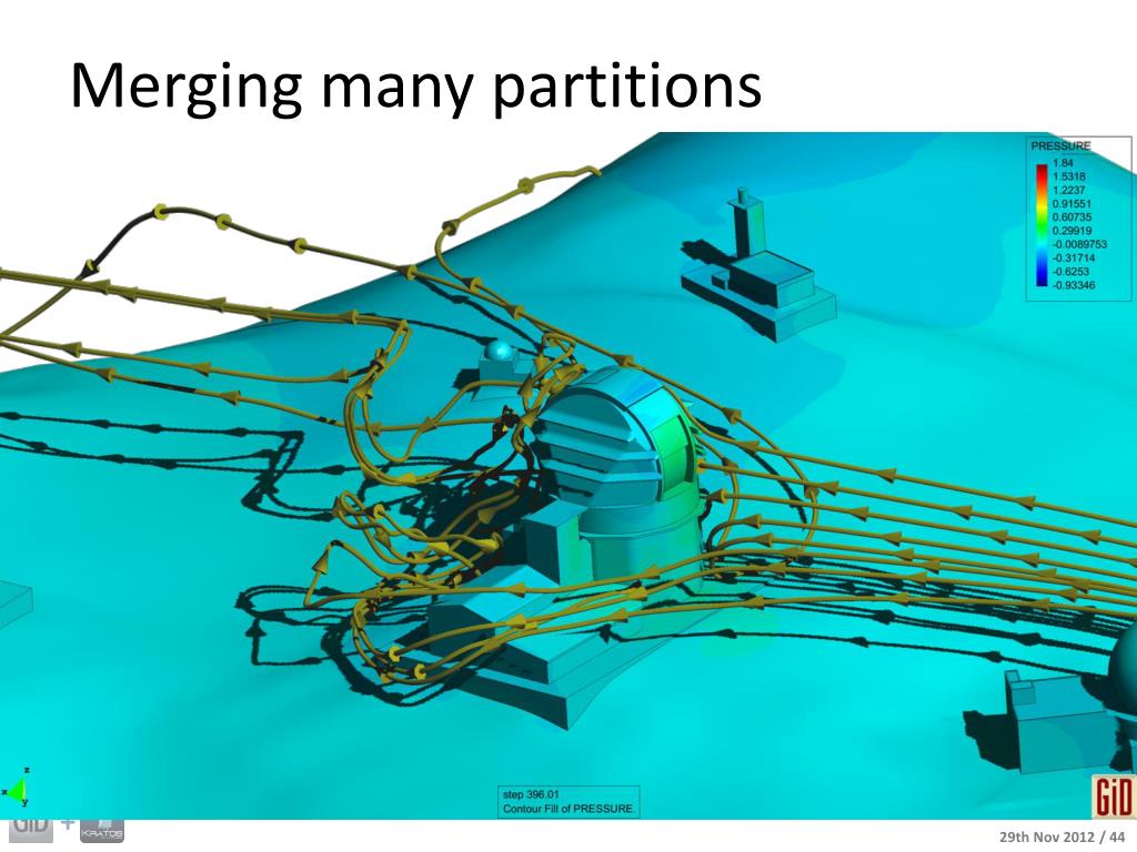 Merging many partitions Racing car example 103,671,344 tetrahedrons Before 96 partitions > 5 hours After 96 partitions 51’ 21” Single file 13’ 25”
