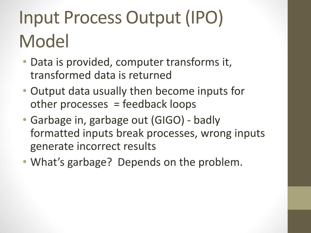 Input Process Output (IPO) Model • Data is provided, computer transforms it, transformed data is returned • Output data usually then become inputs for other processes = feedback loops • Garbage in, garbage out (GIGO) - badly formatted inputs break processes, wrong inputs generate incorrect results • What’s garbage? Depends on the problem.