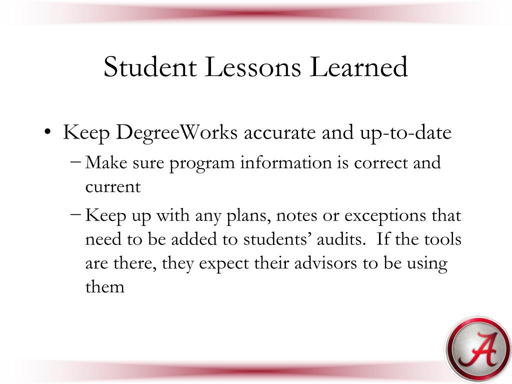 Student Lessons Learned • Keep DegreeWorks accurate and up-to-date • Make sure program information is correct and current • Keep up with any plans, notes or exceptions that need to be added to students’ audits. If the tools are there, they expect their advisors to be using them