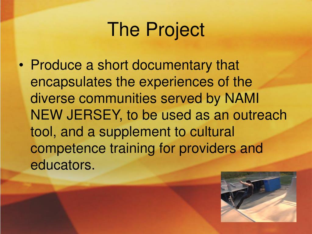 The Project • Produce a short documentary that encapsulates the experiences of the diverse communities served by NAMI NEW JERSEY, to be used as an outreach tool, and a supplement to cultural competence training for providers and educators.