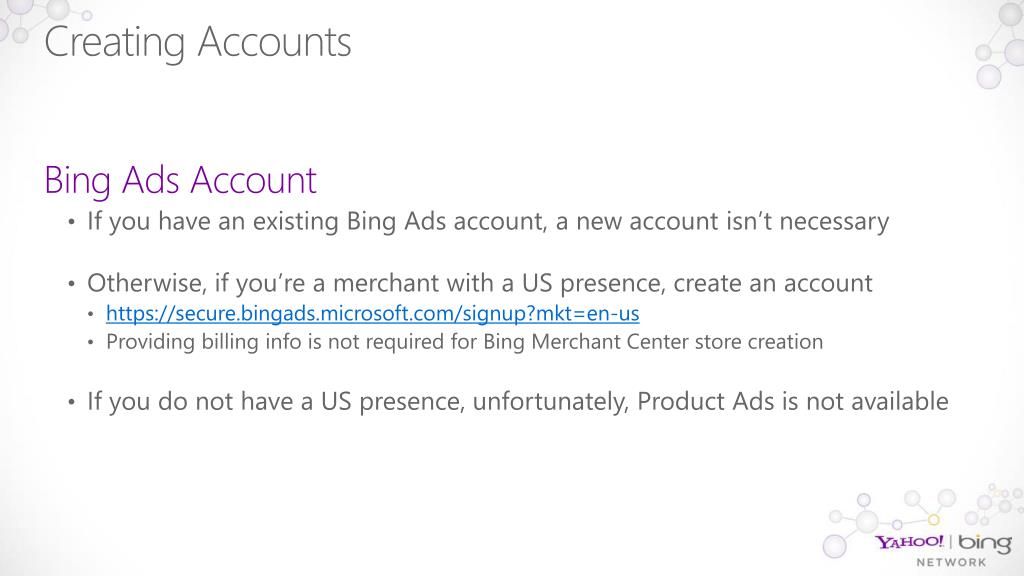 Creating Accounts Bing Ads Account • If you have an existing Bing Ads account, a new account isn’t necessary • Otherwise, if you’re a merchant with a US presence, create an account • https://secure.bingads.microsoft.com/signup?mkt=en-us • Providing billing info is not required for Bing Merchant Center store creation • If you do not have a US presence, unfortunately, Product Ads is not available