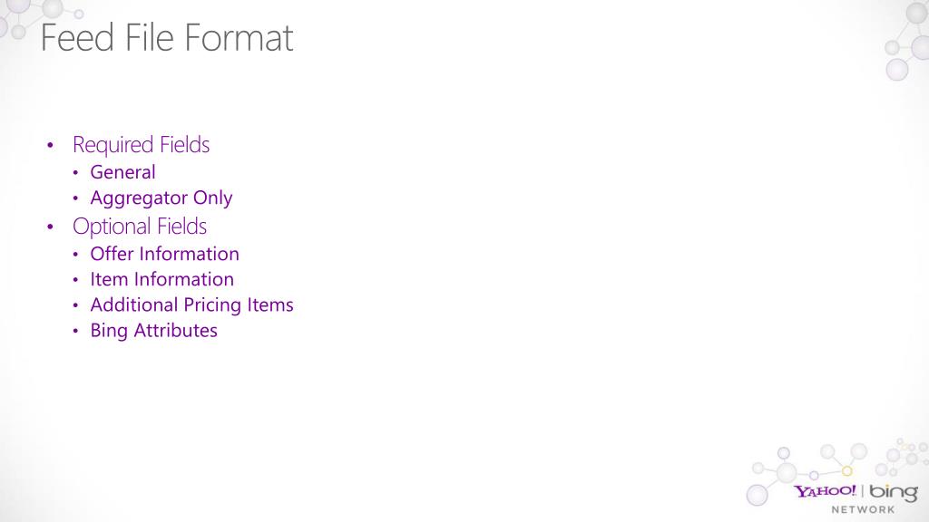 Feed File Format • Required Fields • General • Aggregator Only • Optional Fields • Offer Information • Item Information • Additional Pricing Items • Bing Attributes