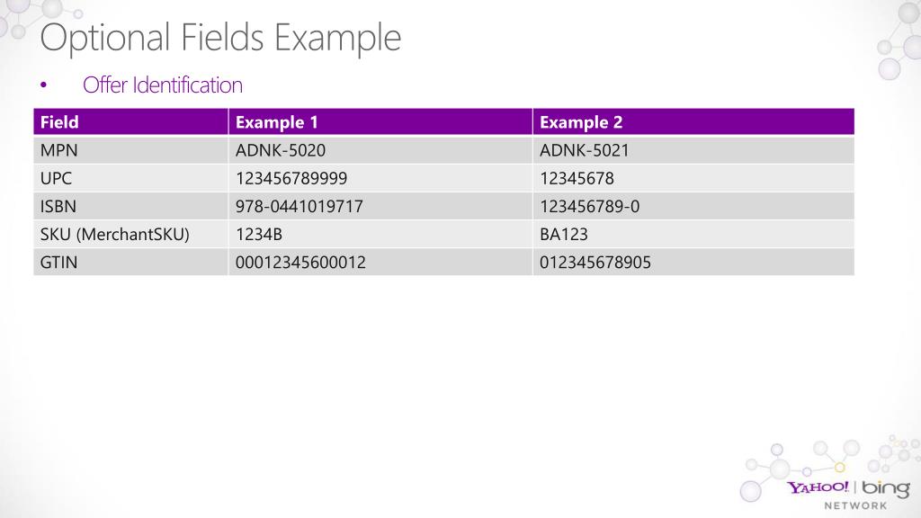Optional Fields Offer Identification • SKU and MPN have to be different for each offer • MPN has to be unique for each offer in a store • duplicates will not publish