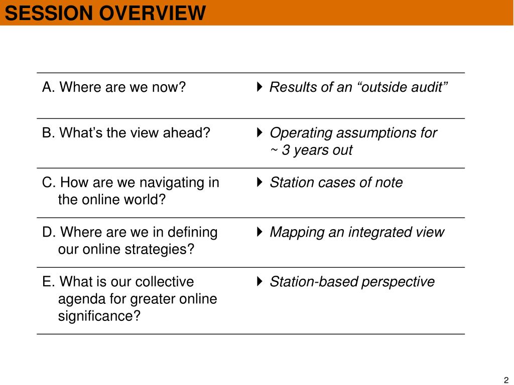 B. What’s the view ahead? • Views for ~3 years out on: • Users’ media mix and desired experience • Role and value of local vs. global • Degree and pace of change in the media environment • Degree and nature of the organization change required