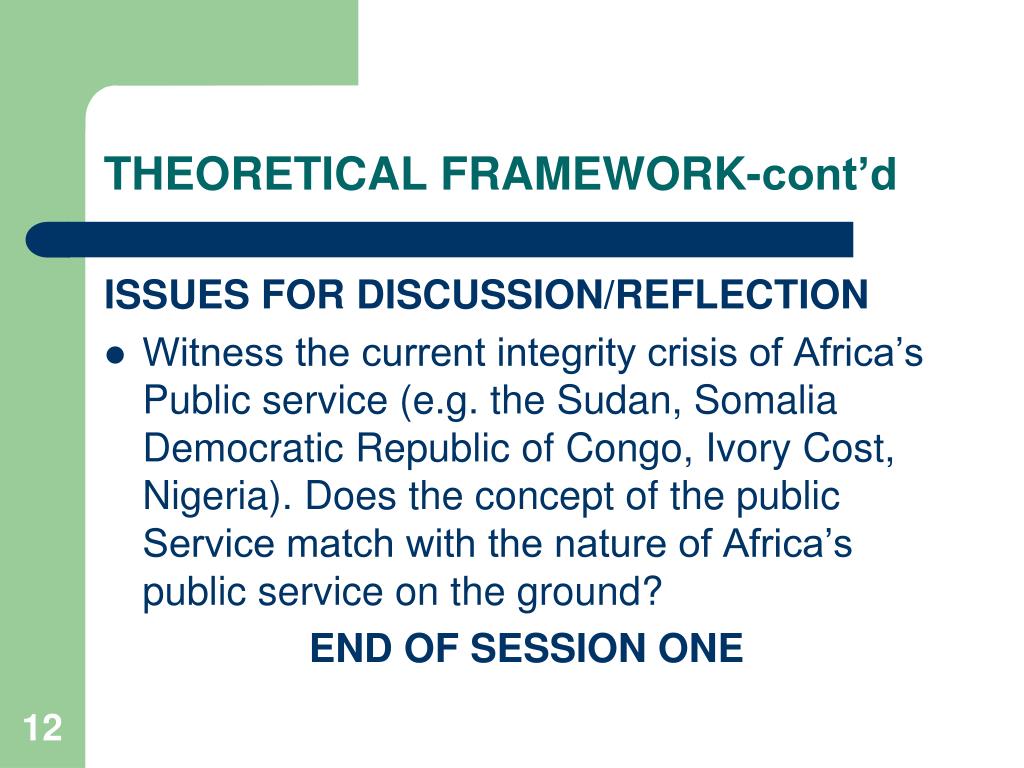 THEORETICAL FRAMEWORK-cont’d ISSUES FOR DISCUSSION/REFLECTION • Witness the current integrity crisis of Africa’s Public service (e.g. the Sudan, Somalia Democratic Republic of Congo, Ivory Cost, Nigeria). Does the concept of the public Service match with the nature of Africa’s public service on the ground? END OF SESSION ONE
