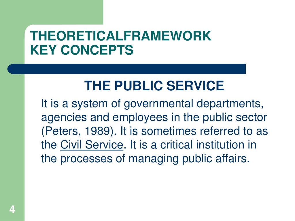 THEORETICALFRAMEWORKKEY CONCEPTS THE PUBLIC SERVICE It is a system of governmental departments, agencies and employees in the public sector (Peters, 1989). It is sometimes referred to as the Civil Service. It is a critical institution in the processes of managing public affairs.