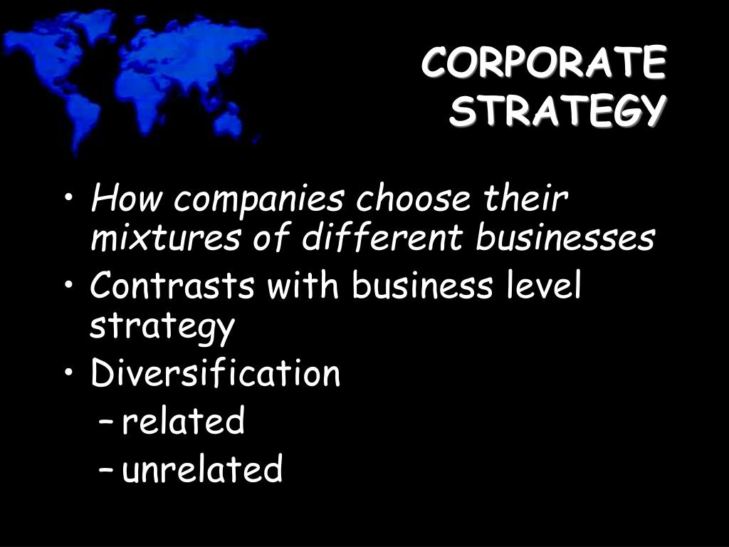 CORPORATE STRATEGY • How companies choose their mixtures of different businesses • Contrasts with business level strategy • Diversification • related • unrelated