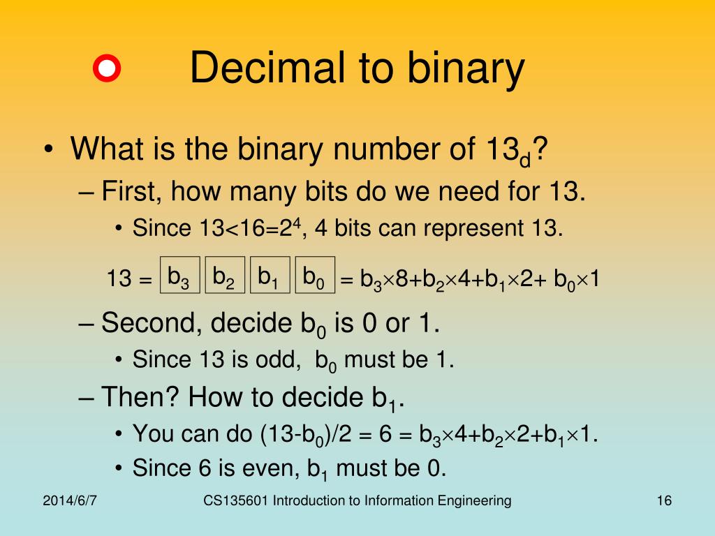 Decimal to binary What is the binary number of 13d? First, how many bits do we need for 13. Since 13<16=24, 4 bits can represent 13. Second, decide b0 is 0 or 1. Since 13 is odd, b0 must be 1. Then? How to decide b1. You can do (13-b0)/2 = 6 = b34+b22+b11. Since 6 is even, b1 must be 0. b3 b2 b1 b0 13 = = b38+b24+b12+ b01 CS135601 Introduction to Information Engineering