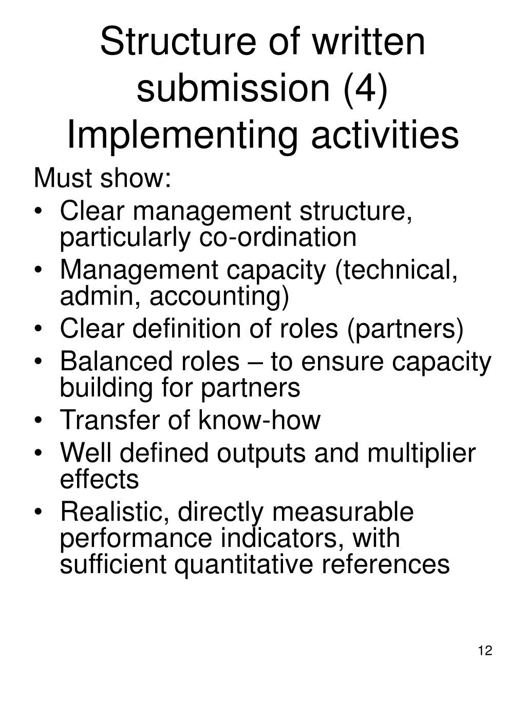 Structure of written submission (4) Implementing activities Must show: • Clear management structure, particularly co-ordination • Management capacity (technical, admin, accounting) • Clear definition of roles (partners) • Balanced roles – to ensure capacity building for partners • Transfer of know-how • Well defined outputs and multiplier effects • Realistic, directly measurable performance indicators, with sufficient quantitative references