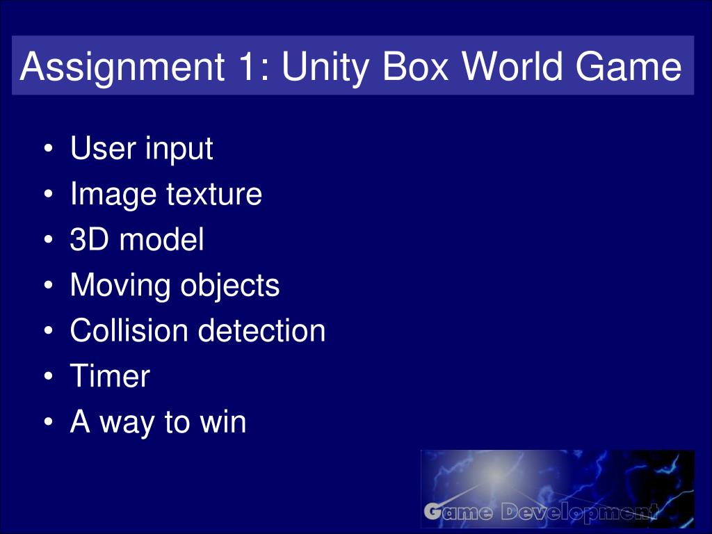 Assignment 1: Unity Box World Game • User input • Image texture • 3D model • Moving objects • Collision detection • Timer • A way to win