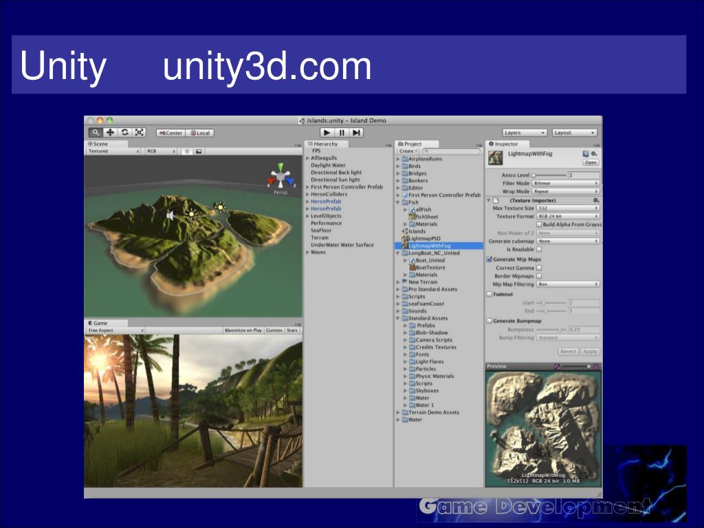 Why Unity? • Cross-platform Windows and Mac OS X • Easy to use (for a game engine) but powerful • It’s free…or at least there is a free version • Web browser plug-in