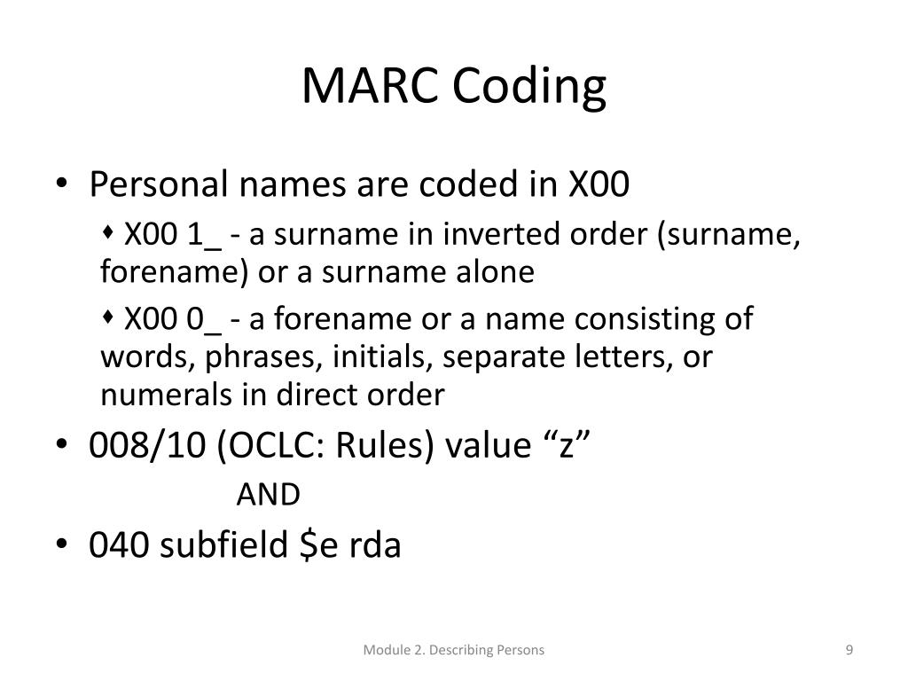 MARC Coding • Personal names are coded in X00 X00 1_ - a surname in inverted order (surname, forename) or a surname alone X00 0_ - a forename or a name consisting of words, phrases, initials, separate letters, or numerals in direct order • 008/10 (OCLC: Rules) value “z” AND • 040 subfield $e rda Module 2. Describing Persons