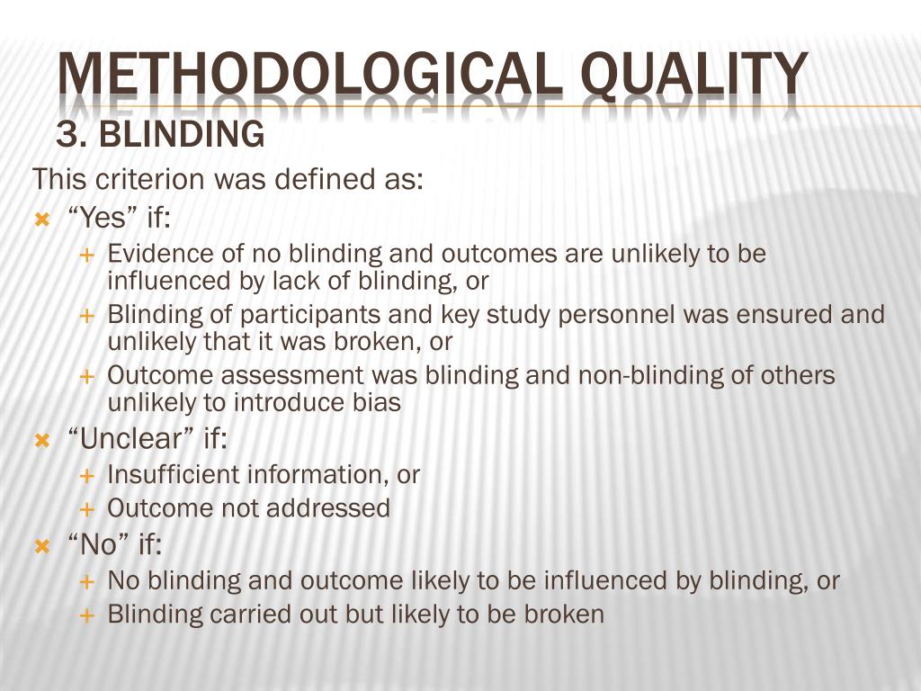 This criterion was defined as: • “Yes” if: • Evidence of no blinding and outcomes are unlikely to be influenced by lack of blinding, or • Blinding of participants and key study personnel was ensured and unlikely that it was broken, or • Outcome assessment was blinding and non-blinding of others unlikely to introduce bias • “Unclear” if: • Insufficient information, or • Outcome not addressed • “No” if: • No blinding and outcome likely to be influenced by blinding, or • Blinding carried out but likely to be broken Methodological quality3. Blinding