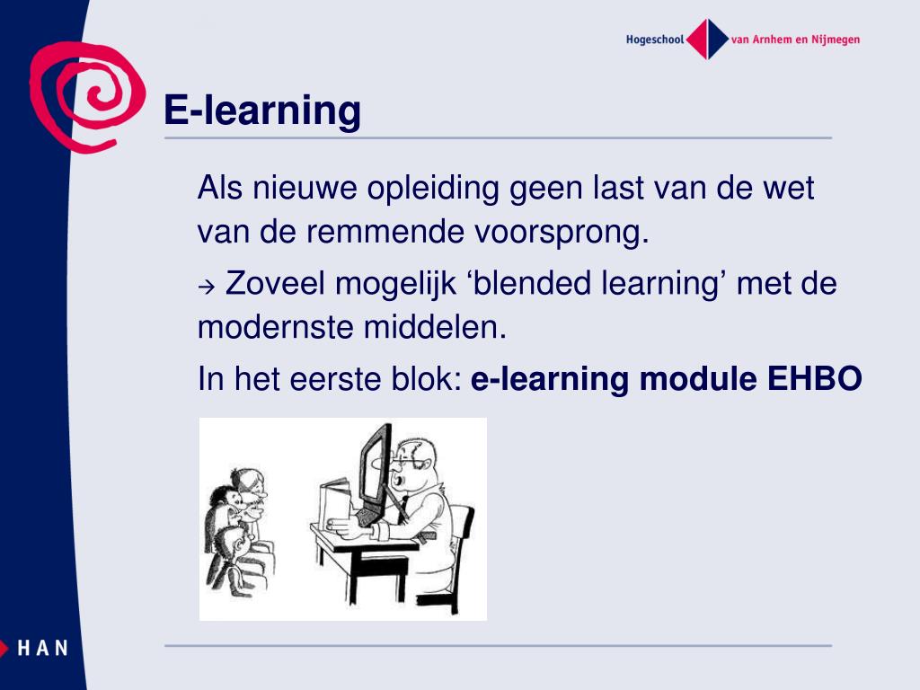 E-learning Als nieuwe opleiding geen last van de wet van de remmende voorsprong. • Zoveel mogelijk ‘blendedlearning’ met de modernste middelen. In het eerste blok: e-learning module EHBO