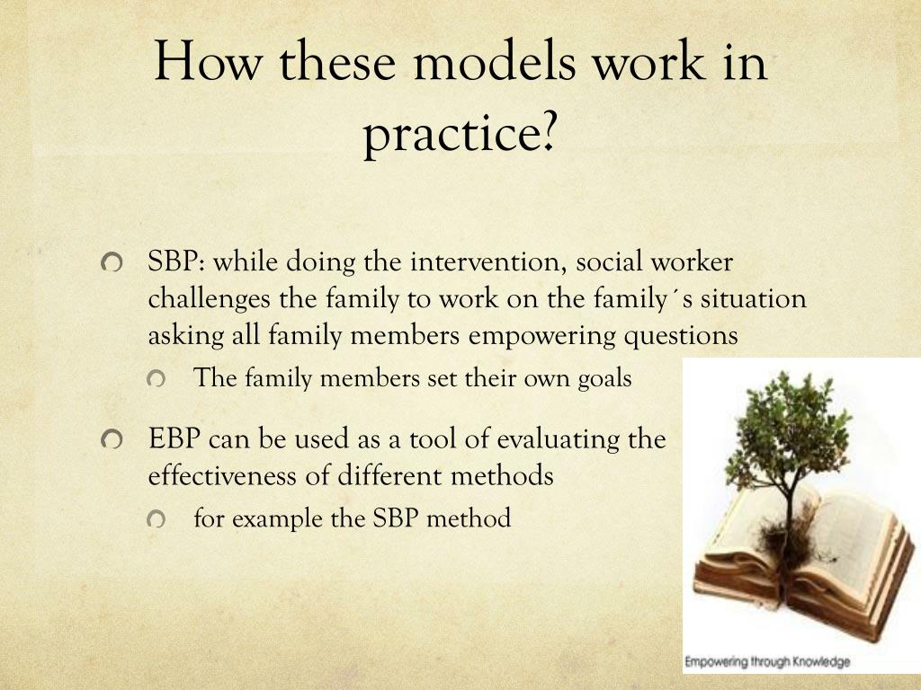 How these models work in practice? • SBP: while doing the intervention, social worker challenges the family to work on the family´s situation asking all family members empowering questions • The family members set their own goals • EBP can be used as a tool of evaluating the effectiveness of different methods • for example the SBP method