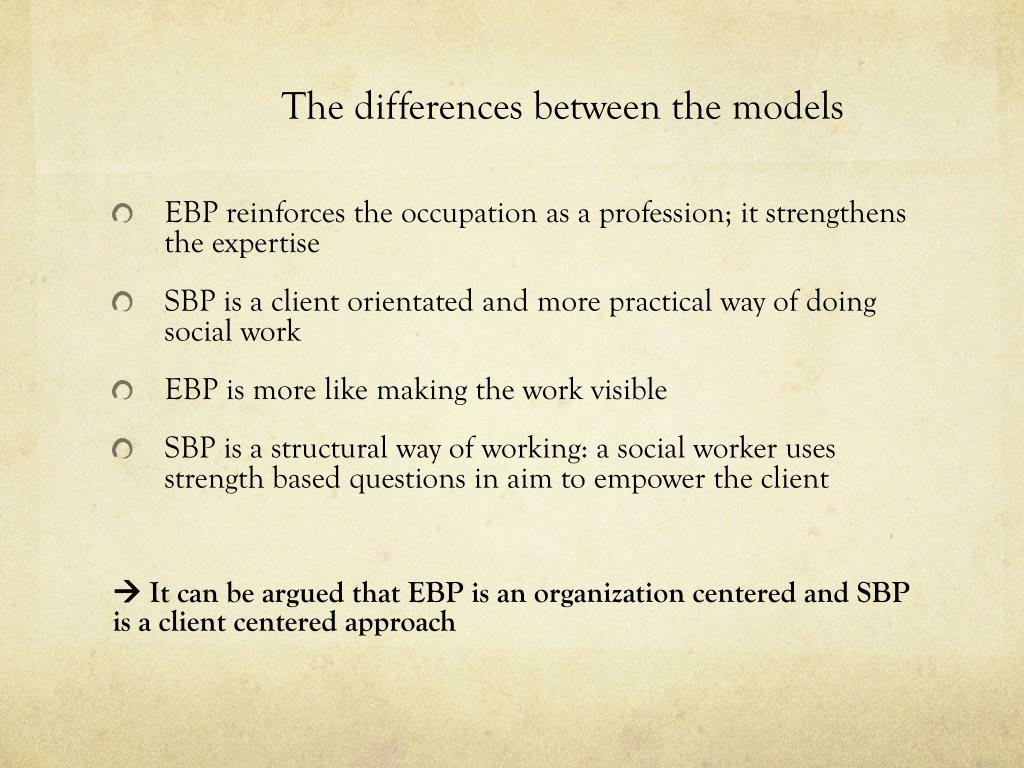 The differences between the models • EBP reinforces the occupation as a profession; it strengthens the expertise • SBP is a client orientated and more practical way of doing social work • EBP is more like making the work visible • SBP is a structural way of working: a social worker uses strength based questions in aim to empower the client It can be argued that EBP is an organization centered and SBP is a client centered approach