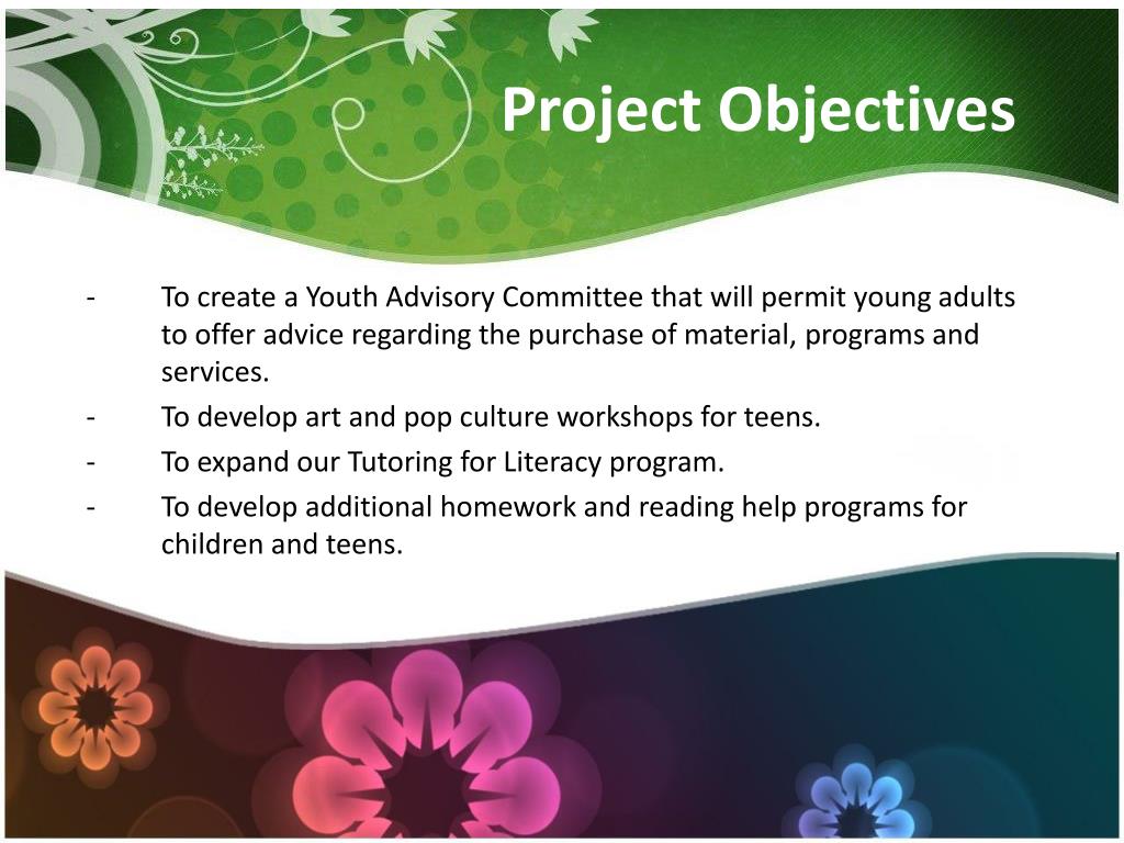 Project Objectives • To create a Youth Advisory Committee that will permit young adults to offer advice regarding the purchase of material, programs and services. • To develop art and pop culture workshops for teens. • To expand our Tutoring for Literacy program. • To develop additional homework and reading help programs for children and teens.