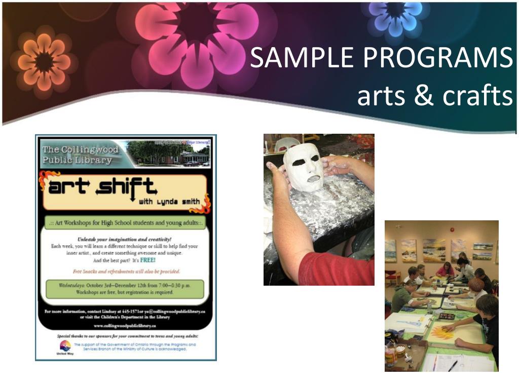 Our Mission • The Collingwood Public Library and TRACKS, have formed a partnership to deliver services to teens and young adults in our community; especially those “at risk.” Our partnership will enable us to achieve common goals and enhance service delivery to young people in our community. • We will use arts and culture as the vehicle to “reach” teens and deliver our programs and services. “The ability to engage and motivate children and youth from all socioeconomic levels in education and community is a well respected strength of arts and culture.” (Creative City Network of Canada 2005. Personal and social development of children and youth.) • It is evident that art programmes have a positive effect on teens; and consequently help build self-esteem and positive assets in young people. In essence, these positive attributes help us build better, stronger communities. • Promote and market the library and library services to teens, especially those at-risk.